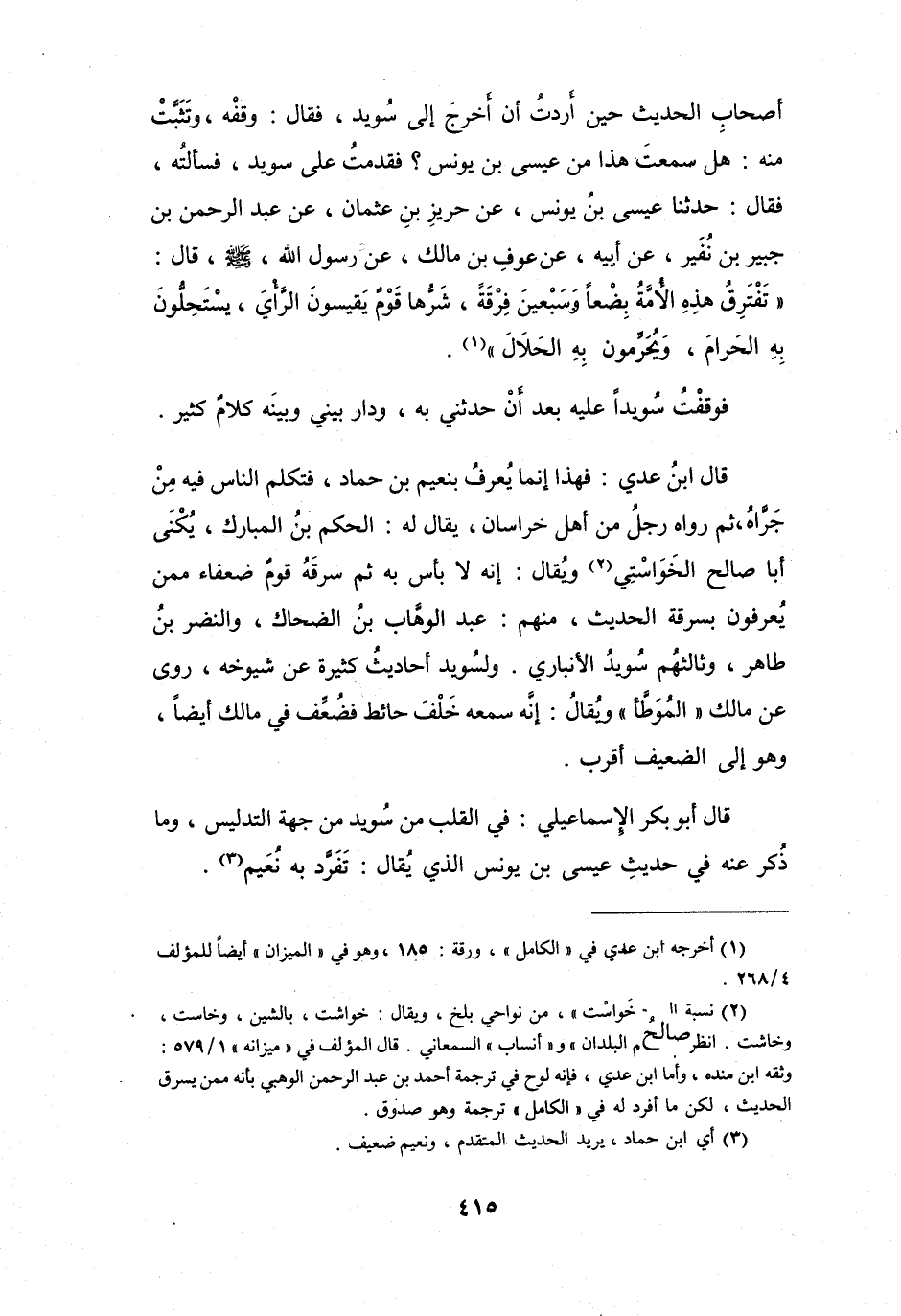 قَالَ ابْنُ عَدِيٍّ: فَهَذَا إِنَّمَا يُعرَفُ بِنُعَيْمِ بنِ حَمَّادٍ، فَتَكَلَّمَ النَّاسُ فِيْهِ مِنْ جَرَّاهُ، ثُمَّ رَوَاهُ رَجُلٌ مِنْ أَهْلِ خُرَاسَانَ، يُقَالُ لَهُ: الحَكَمُ بنُ المُبَارَكِ، يُكْنَى أَبَا صَالِحٍ الخَوَاسْتِيَّ (2) ، وَيُقَالُ: إِنَّهُ لاَ بَأْسَ بِهِ، ثُمَّ سَرَقَهُ قَوْمٌ ضُعَفَاءُ مِمَّنْ يُعْرَفُوْنَ بِسَرِقَةِ الحَدِيْثِ، مِنْهُم: عَبْدُ الوَهَّابِ بنُ الضَّحَّاكِ، وَالنَّضْرُ بنُ طَاهِرٍ، وَثَالِثُهُم سُوَيْدٌ الأَنْبَارِيُّ.