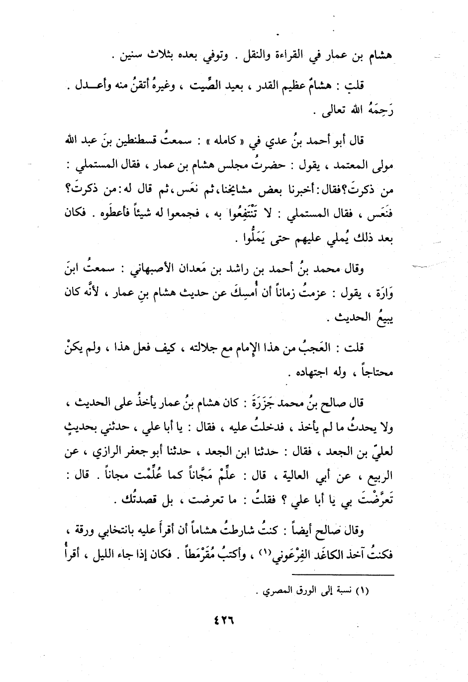 وَقَالَ صَالِحٌ أَيْضاً: كُنْتُ شَارَطْتُ هِشَاماً أَنْ أَقْرَأَ عَلَيْهِ بِانْتِخَابِي وَرَقَةً، فَكُنْتُ آخُذُ الكَاغَدَ الفِرْعَوْنِيَّ (1) ، وَأَكْتُبُ مُقَرْمَطاً، فكَانَ إِذَا جَاءَ اللَّيْلُ، أَقْرَأُ