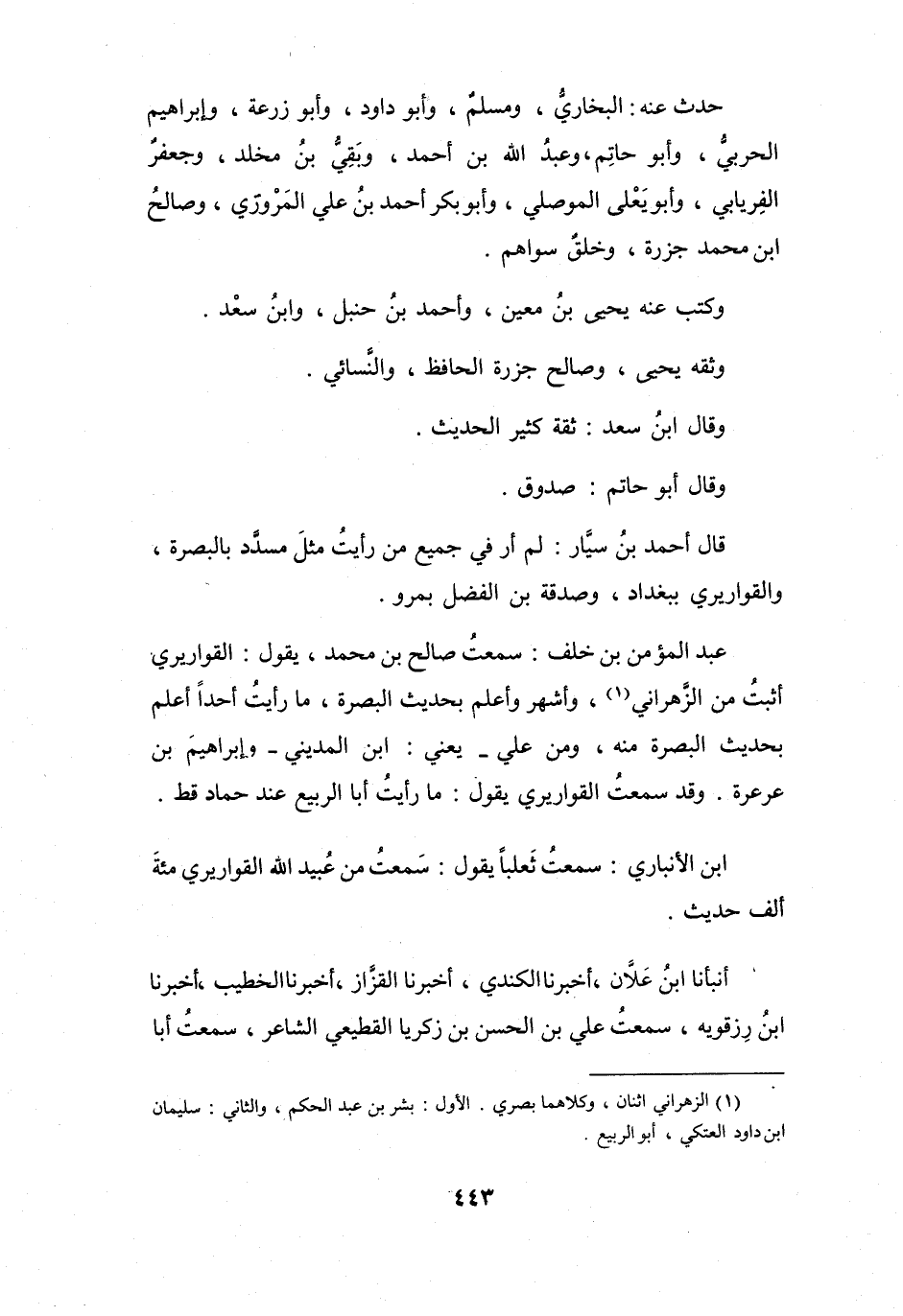 القَوَارِيْرِيُّ أَثْبَتُ مِنَ الزَّهْرَانِيِّ (1) ، وَأَشْهَرُ وَأَعْلَمُ بِحَدِيْثِ البَصْرَةِ، مَا رَأَيْتُ أَحَداً أَعْلَمَ بِحَدِيْثِ البَصْرَةِ مِنْهُ، وَمِن عَلِيٍّ -يَعْنِي: ابْنَ المَدِيْنِيِّ- وَإِبْرَاهِيْمَ بنِ عَرْعَرَةَ.