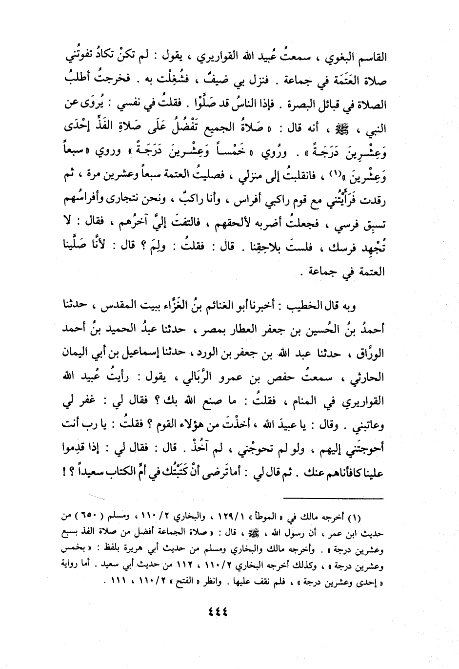 (1) أخرجه مالك في " الموطأ " 1 / 129، والبخاري 2 / 110، ومسلم (650) من حديث ابن عمر، أن رسول الله، صلى الله عليه وسلم، قال: " صلاة الجماعة أفضل من صلاة الفذ بسبع وعشرين درجة ".