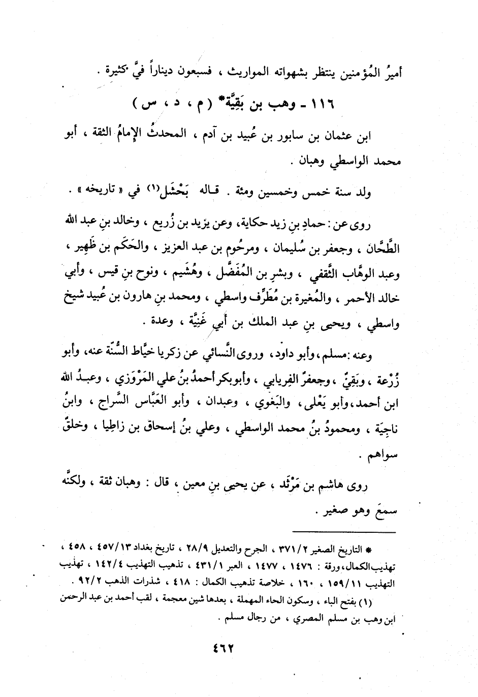 116 - وَهْبُ بنُ بَقِيَّةَ بنِ عُثْمَانَ بنِ سَابُوْرَ بنِ عُبَيْدِ بنِ آدَمَ * (م، د، س)