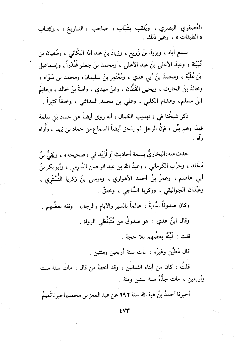 العُصْفُرِيُّ، البَصْرِيُّ، وَيُلَقَّبُ بِشَبَابٍ، صَاحِبُ (التَّارِيْخِ) ، وَكِتَابِ (الطَّبَقَاتِ) ، وَغَيْرِ ذَلِكَ.
