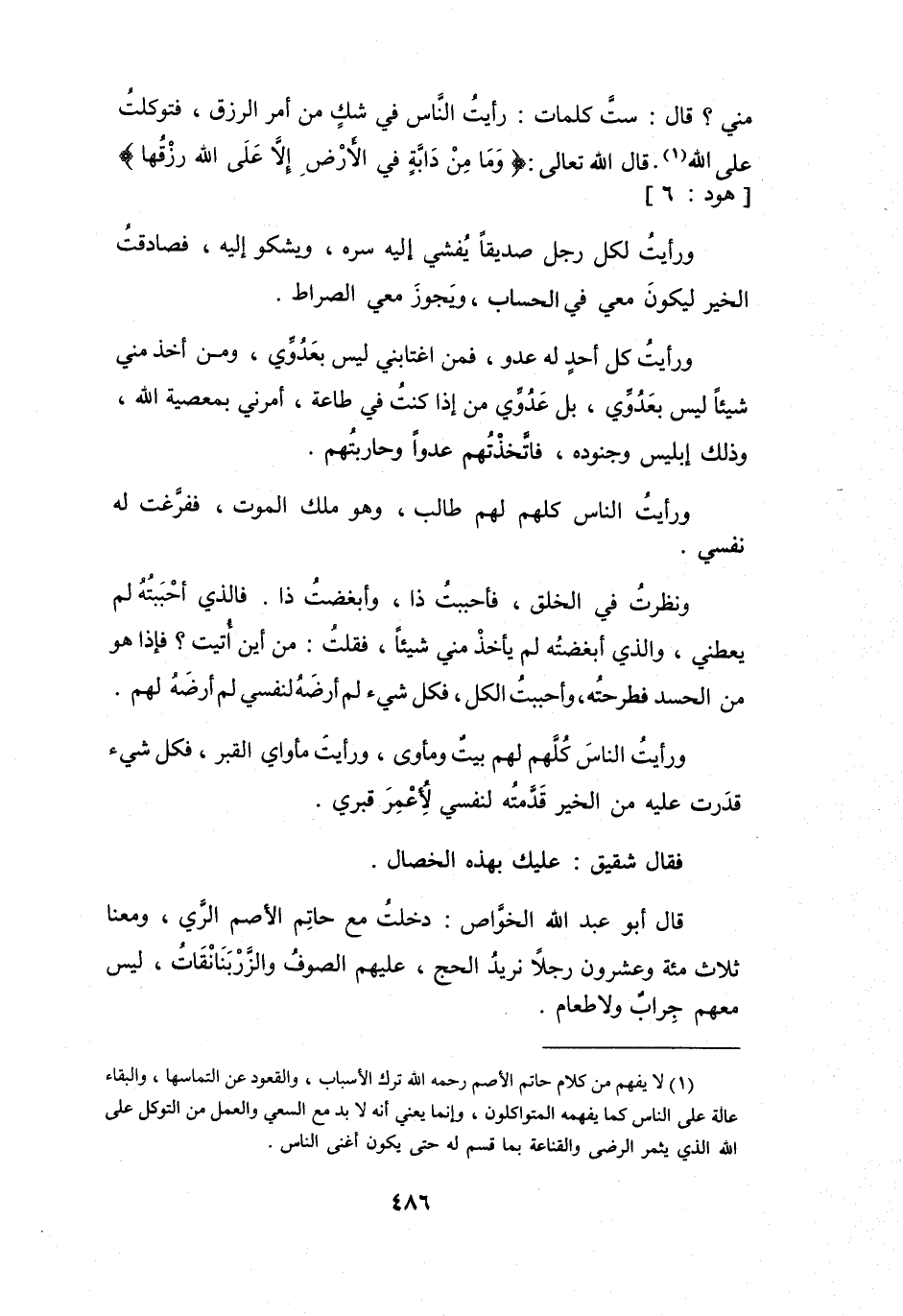 (1) لا يفهم من كلام حاتم الأصم رحمه الله ترك الاسباب، والقعود عن التماسها، والبقاء عالة على الناس كما يفهمه المتواكلون، وإنما يعني أنه لابد مع السعي والعمل من التوكل على الله الذي يثمر الرضى والقناعة بما قسم له حتى يكون أغنى الناس.