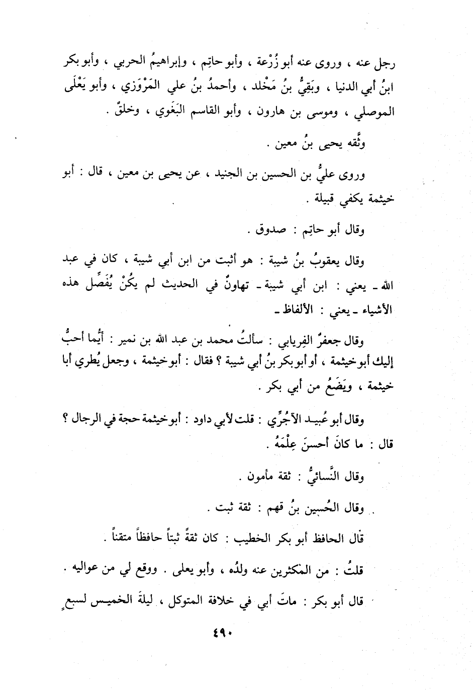 وَرَوَى: عَلِيُّ بنُ الحُسَيْنِ بنِ الجُنَيْدِ، عَنْ يَحْيَى بنِ مَعِيْنٍ، قَالَ: أَبُو خَيْثَمَةَ يَكفِي قَبِيْلَةً.