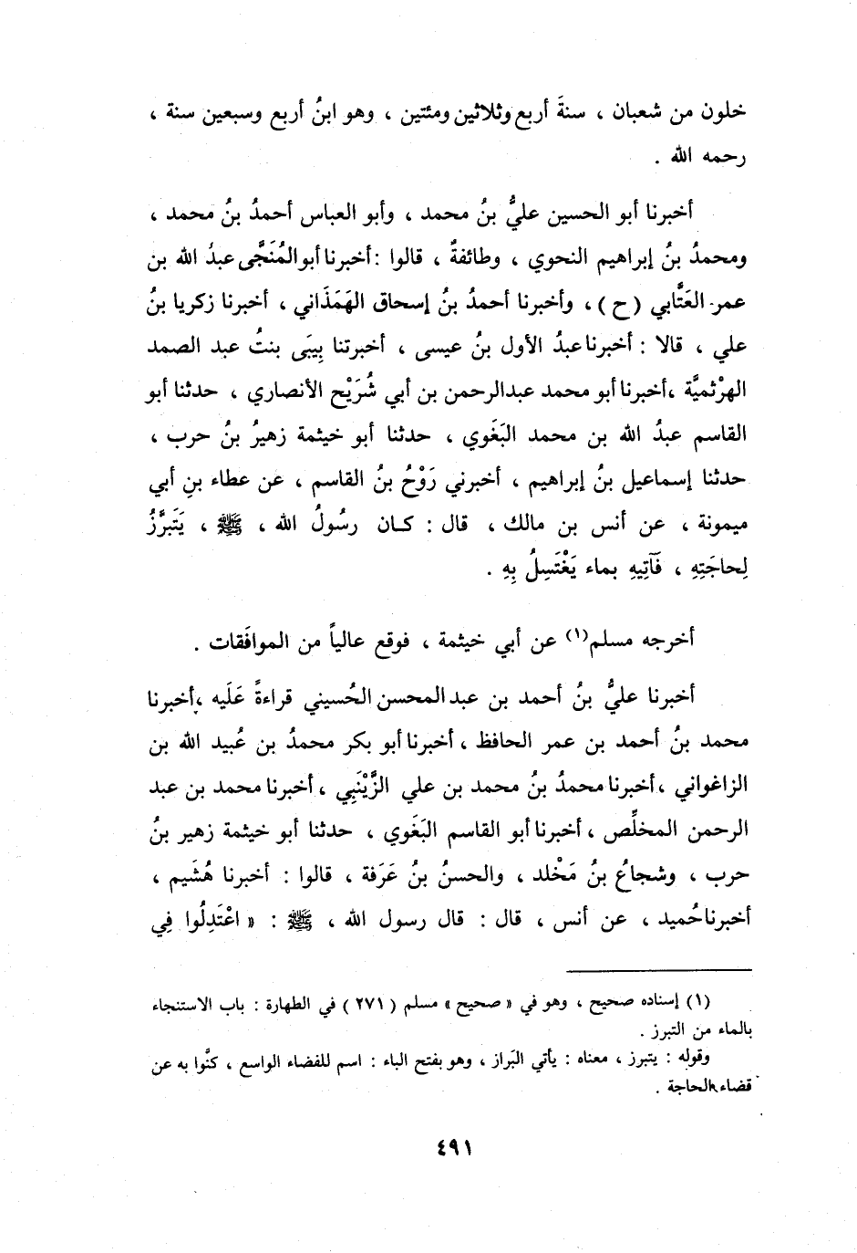 أَخْبَرَنَا عَبْدُ الأَوَّلِ بنُ عِيْسَى، أَخْبَرَتْنَا بِيْبَى بِنْتُ عَبْدِ الصَّمَدِ الهَرْثَمِيَّةُ، أَخْبَرَنَا أَبُو مُحَمَّدٍ عَبْدُ الرَّحْمَنِ بنُ أَبِي شُرَيْحٍ الأَنْصَارِيُّ، حَدَّثَنَا أَبُو القَاسِمِ عَبْدُ اللهِ بنُ مُحَمَّدٍ البَغَوِيُّ، حَدَّثَنَا أَبُو خَيْثَمَةَ زُهَيْرُ بنُ حَرْبٍ، حَدَّثَنَا إِسْمَاعِيْلُ بنُ إِبْرَاهِيْمَ، أَخْبَرَنِي رَوْحُ بنُ القَاسِمِ، عَنْ عَطَاءِ بنِ أَبِي مَيْمُوْنَةَ، عَنْ أَنَسِ بنِ مَالِكٍ، قَالَ: