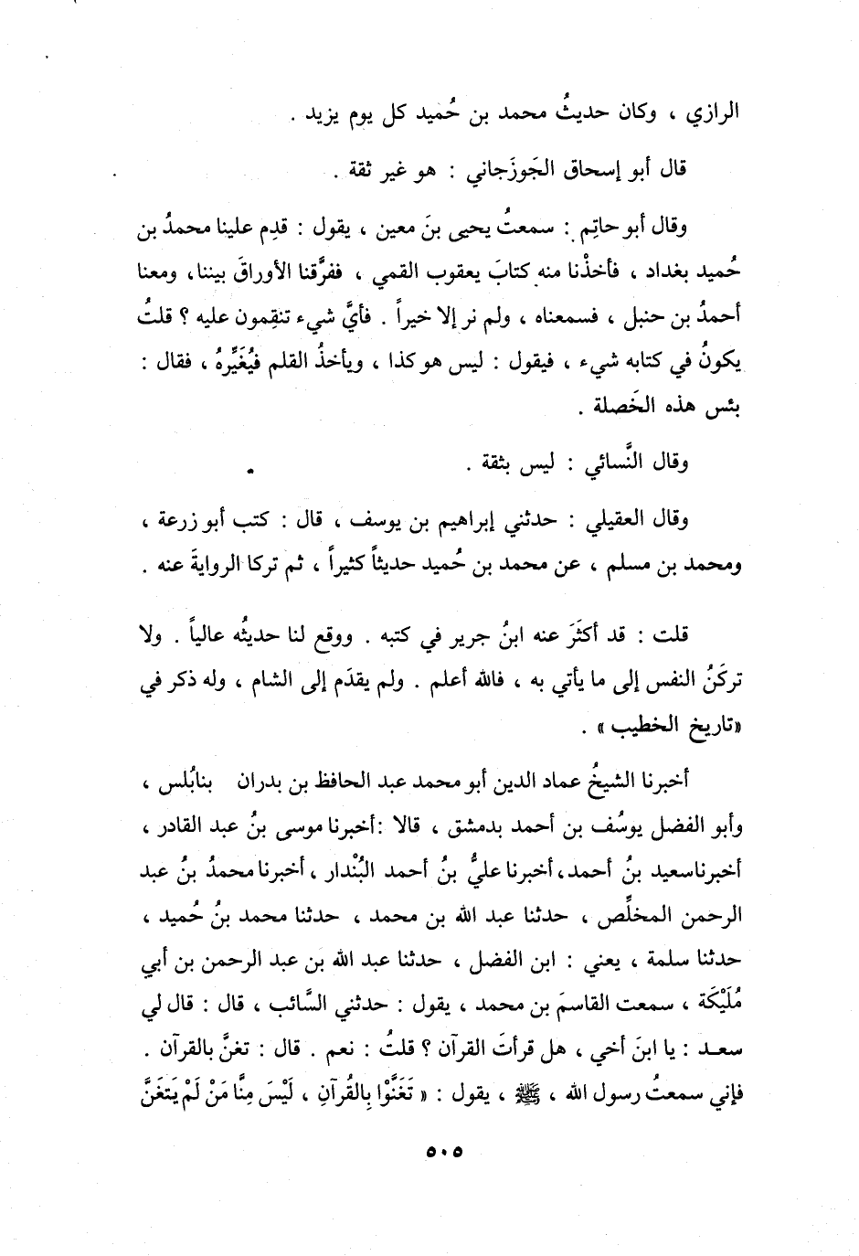 قَدِمَ عَلَيْنَا مُحَمَّدُ بنُ حُمَيْدٍ بَغْدَادَ، فَأَخَذْنَا مِنْهُ كِتَابَ يَعْقُوْبَ القُمِّيِّ، فَفَرَّقْنَا الأَوْرَاقَ بَيْنَنَا، وَمَعَنَا أَحْمَدُ بنُ حَنْبَلٍ، فَسَمِعْنَاهُ، وَلَمْ نَرَ إِلاَّ خَيْراً، فَأَيَّ شَيْءٍ تَنْقِمُوْنَ عَلَيْهِ؟