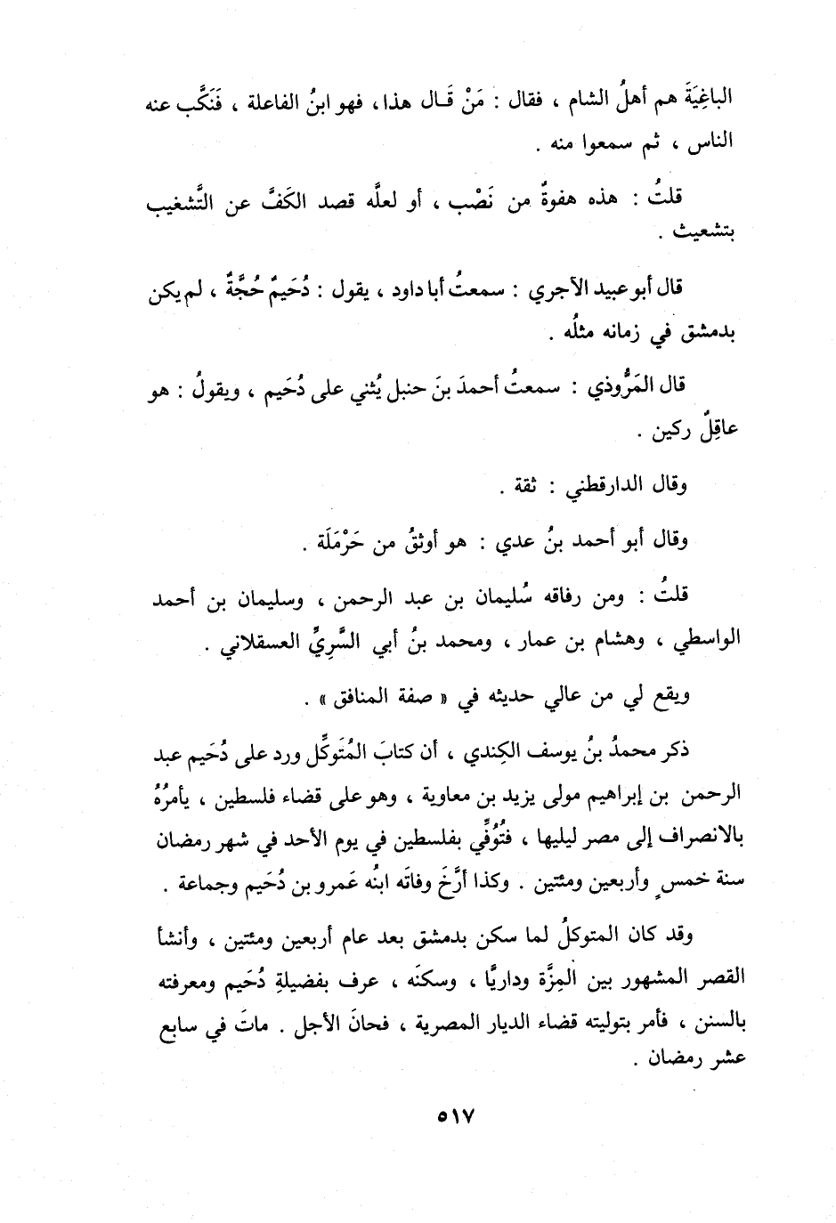 قَالَ المَرُّوْذِيُّ: سَمِعْتُ أَحْمَدَ بنَ حَنْبَلٍ يُثْنِي عَلَى دُحَيْمٍ، وَيَقُوْلُ: