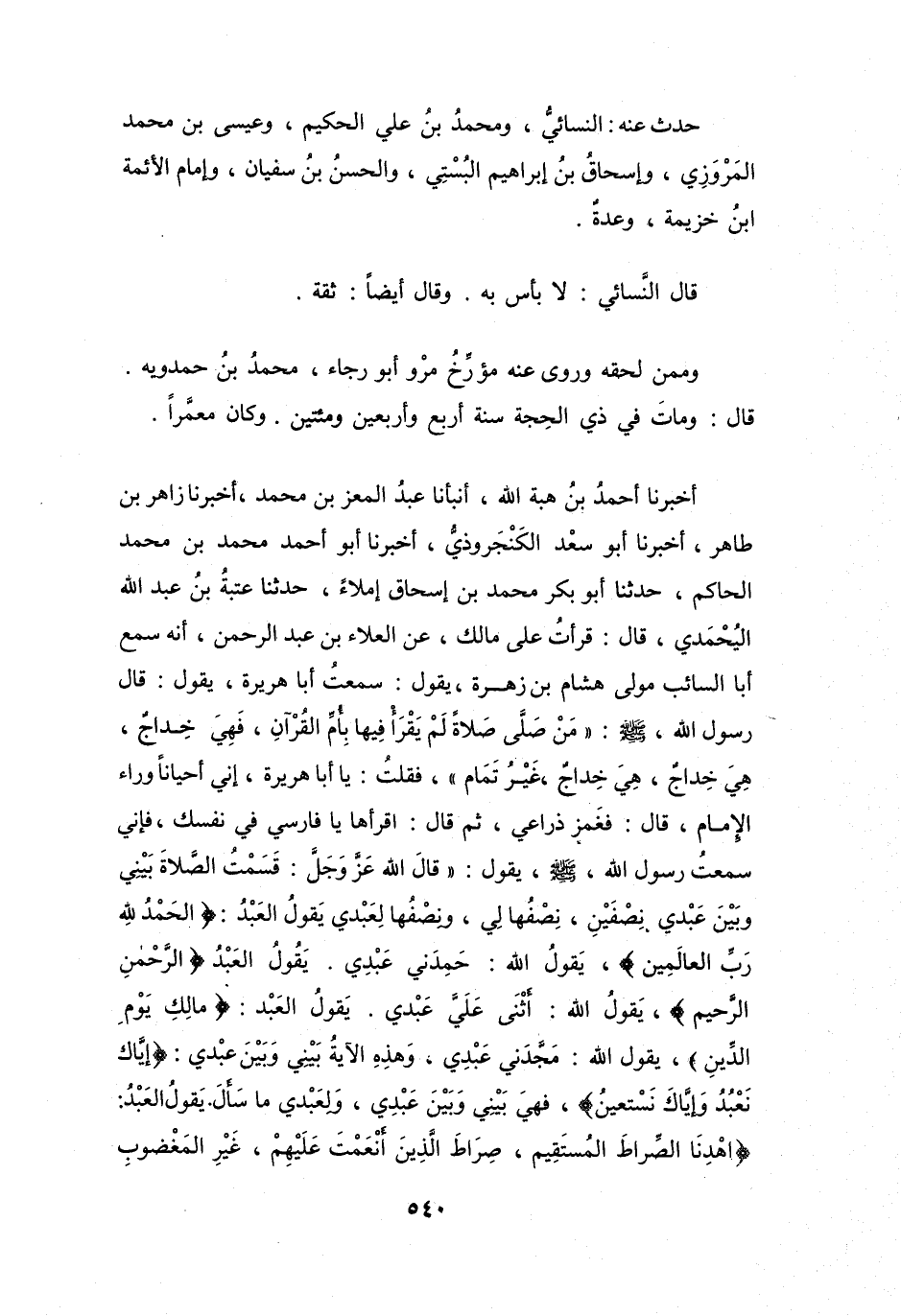قَالَ رَسُوْلُ اللهِ -صَلَّى اللَّهُ عَلَيْهِ وَسَلَّمَ-: (مَنْ صَلَّى صَلاَةً لَمْ يَقْرَأْ فِيْهَا بِأُمِّ القُرْآنِ، فَهِيَ خِدَاجٌ، هِيَ خِدَاجٌ، هِيَ خِدَاجٌ، غَيْرُ تَمَامٍ) .