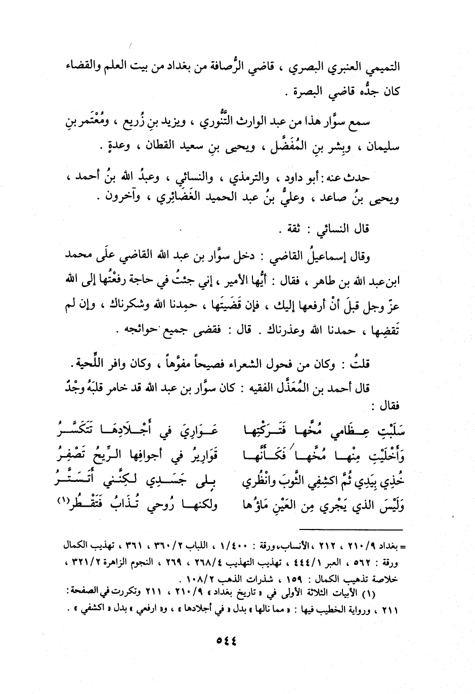 (1) الابيات الثلاثة الأولى في " تاريخ بغداد " 9 / 210، 211 وتكررت في الصفحة: 211، ورواية الخطيب فيها: " مما نالها " بدل " في أجلادها "، و" ارفعي " بدل " اكشفي ".