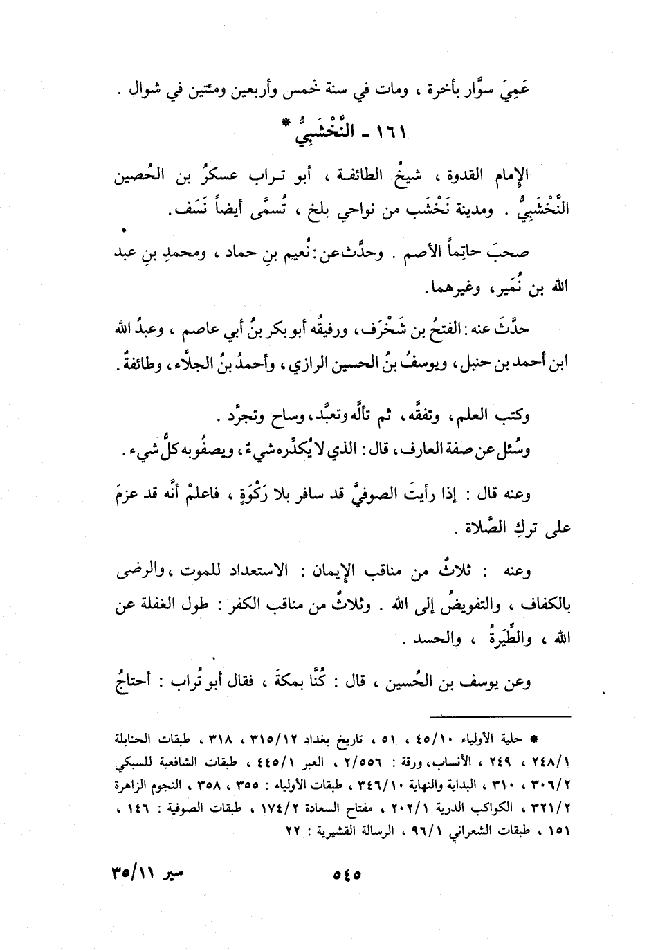 (*) حلية الأولياء 10 / 45، 51، تاريخ بغداد 12 / 315، 318، طبقات الحنابلة 1 / 248، 249، الأنساب، ورقة: 556 / 2، العبر 1 / 445، طبقات الشافعية للسبكي 2 / 306، 310، البداية والنهاية 10 / 346، طبقات الأولياء: 355، 358، النجوم الزاهرة 2 / 321، الكواكب الدرية 1 / 202، مفتاح السعادة 2 / 174، طبقات الصوفية: 146، 151، طبقات الشعراني 1 / 96، الرسالة القشيرية: 22