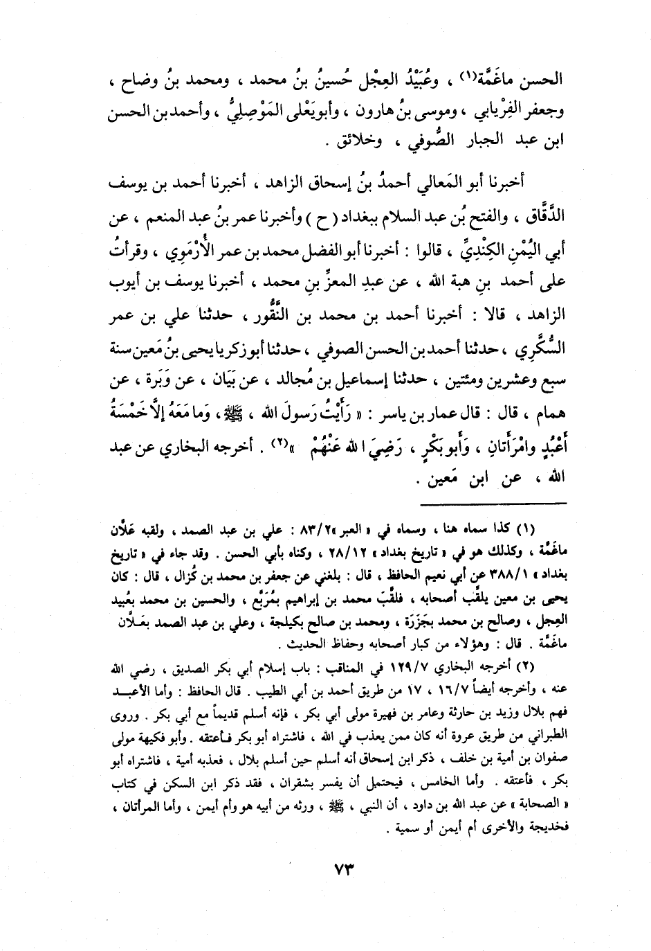 (2) أخرجه البخاري 7 / 129 في المناقب: باب إسلام أبي بكر الصديق، رضي الله عنه، وأخرجه أيضا 7 / 16، 17 من طريق أحمد بن أبي الطيب. قال الحافظ: وأما الاعبد فهم بلال وزيد بن حارثة وعامر بن فهيرة مولى أبي بكر، فإنه أسلم قديما مع أبي بكر.