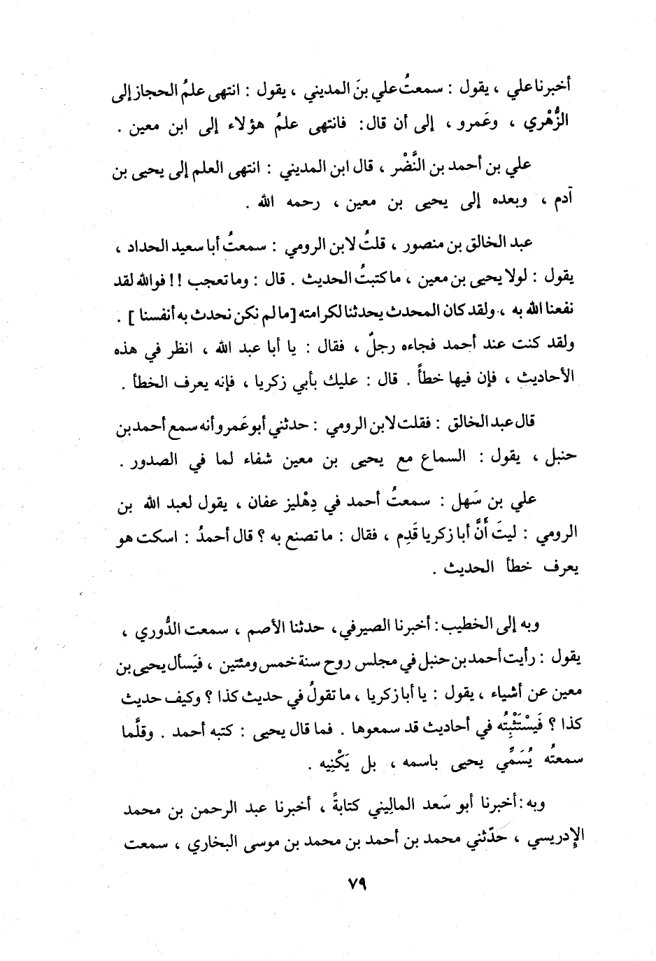 رَأَيْتُ أَحْمَدَ بنَ حَنْبَلٍ فِي مَجْلِسِ رَوْحٍ سَنَةَ خَمْسٍ وَمائَتَيْنِ، فَيَسْأَلُ يَحْيَى بنَ مَعِيْنٍ عَنْ أَشْيَاءَ، يَقُوْلُ: يَا أَبَا زَكَرِيَّا، مَا تَقُوْلُ فِي حَدِيْثِ كَذَا؟ وَكَيْفَ حَدِيْثُ كَذَا؟ فَيَسْتَثْبِتُهُ فِي أَحَادِيْثَ قَدْ سَمِعُوْهَا.