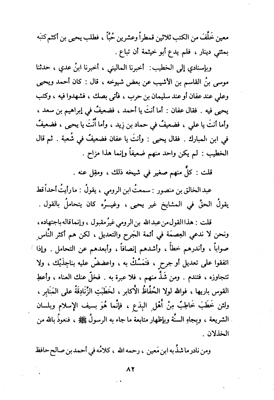 فَخَلِّ عَنْكَ العَنَاءَ، وَأَعطِ القَوسَ بَارِيَهَا، فَوَاللهِ لَوْلاَ الحُفَّاظُ الأَكَابِرُ، لَخَطَبَتِ الزَّنَادِقَةُ عَلَى المَنَابِرِ، وَلَئِنْ خَطَبَ خَاطِبٌ مِنْ أَهْلِ البِدَعِ، فَإِنَّمَا هُوَ بِسَيفِ الإِسْلاَمِ، وَبِلِسَانِ الشَّرِيعَةِ، وَبِجَاهِ السُّنَّةِ، وَبِإِظهَارِ مُتَابَعَةِ مَا جَاءَ بِهِ الرَّسُوْلُ -صَلَّى اللَّهُ عَلَيْهِ وَسَلَّمَ- فَنَعُوْذُ بِاللهِ مِنَ الخِذْلاَنِ.