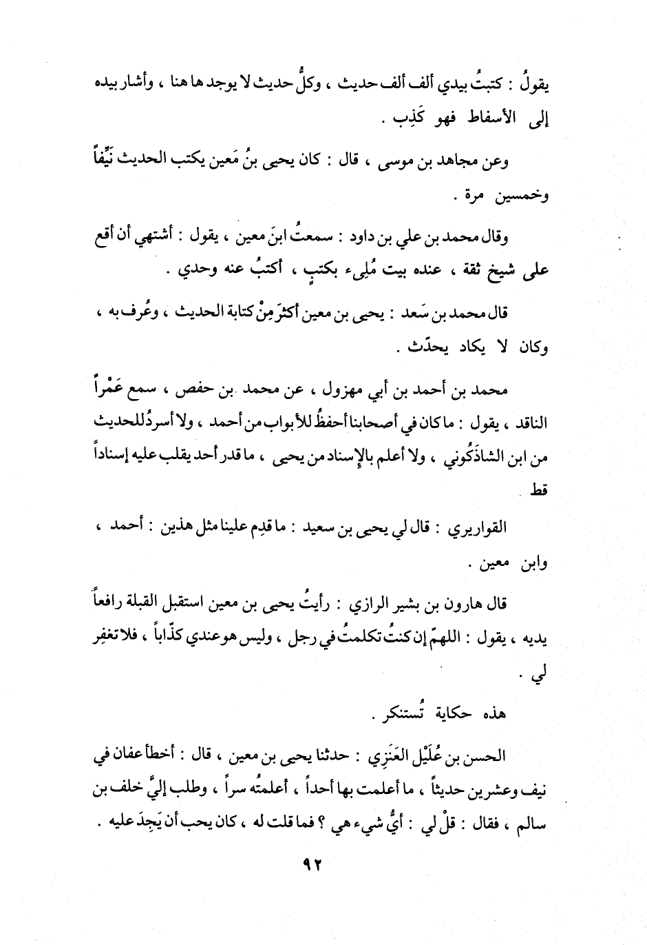 قَالَ هَارُوْنُ بنُ بَشِيْرٍ الرَّازِيُّ: رَأَيْتُ يَحْيَى بنَ مَعِيْنٍ اسْتَقبَلَ القِبْلَةَ رَافِعاً يَدَيْهِ، يَقُوْلُ: اللَّهُمَّ إِنْ كُنْتُ تَكَلَّمتُ فِي رَجُلٍ، وَلَيْسَ هُوَ عِنْدِي كَذَّاباً، فَلاَ تَغْفِرْ لِي.