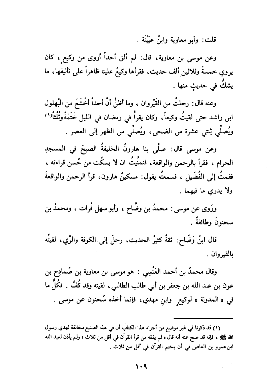 وَعَنْ مُوْسَى، قَالَ: صَلَّى بِنَا هَارُوْنُ الخَلِيْفَةُ الصُّبْحَ فِي المَسْجِدِ الحَرَامِ، فَقَرَأَ بِالرَّحْمَنِ وَالوَاقِعَةِ، فَتَمَنَّيْتُ أَنْ لاَ يَسْكُتَ مِنْ حُسْنِ قِرَاءتِهِ، فَقُمْتُ إِلَى الفُضَيْلِ، فَسَمِعْتُهُ يَقُوْلُ: مِسْكِيْنٌ هَارُوْنُ، قَرَأَ الرَّحْمَنَ وَالوَاقِعَةَ وَلاَ يَدْرِي مَا فِيْهِمَا.