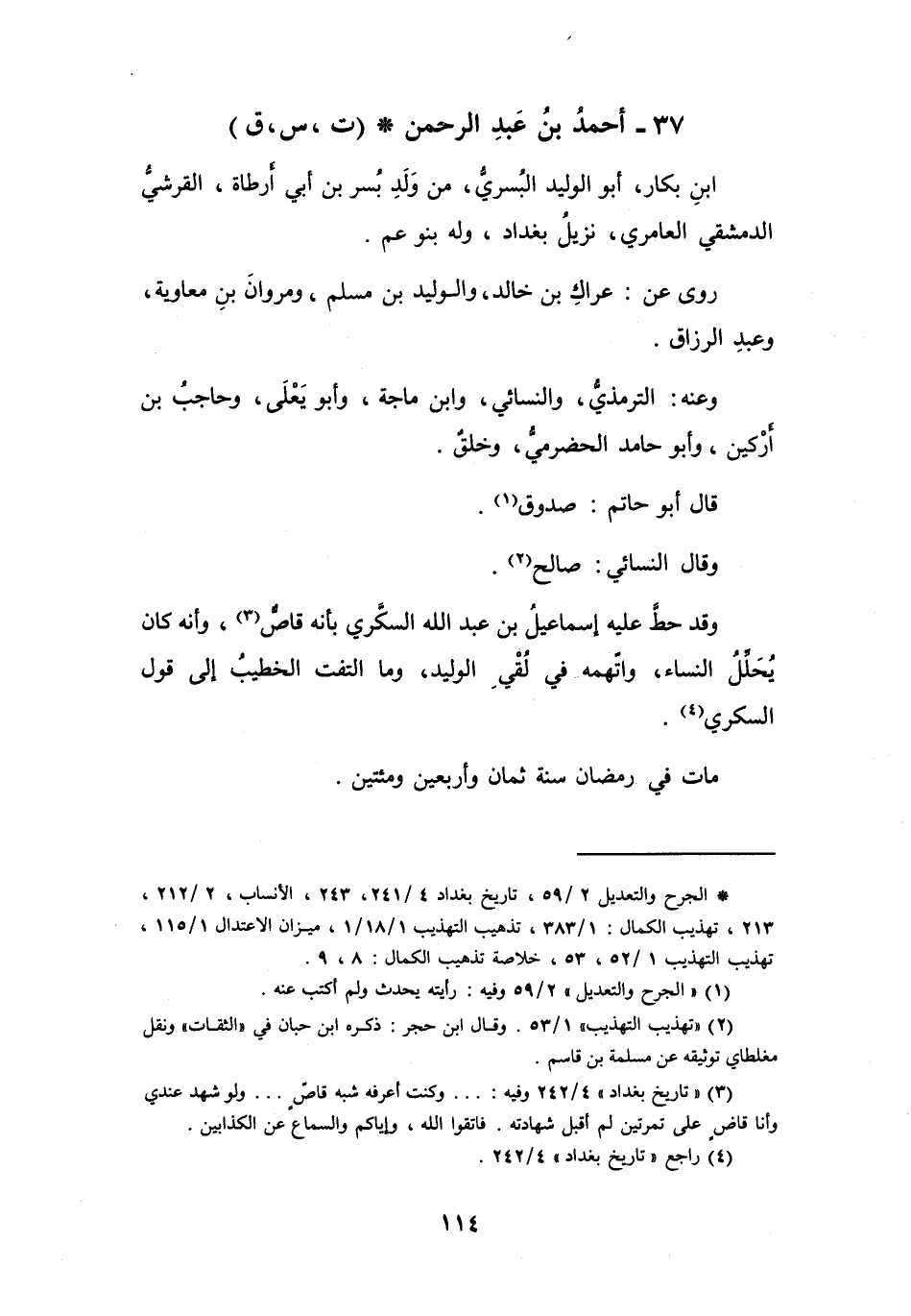 37 - أَحْمَدُ بنُ عَبْدِ الرَّحْمَنِ بنِ بَكَّارٍ البُسْرِيُّ * (ت، س، ق)