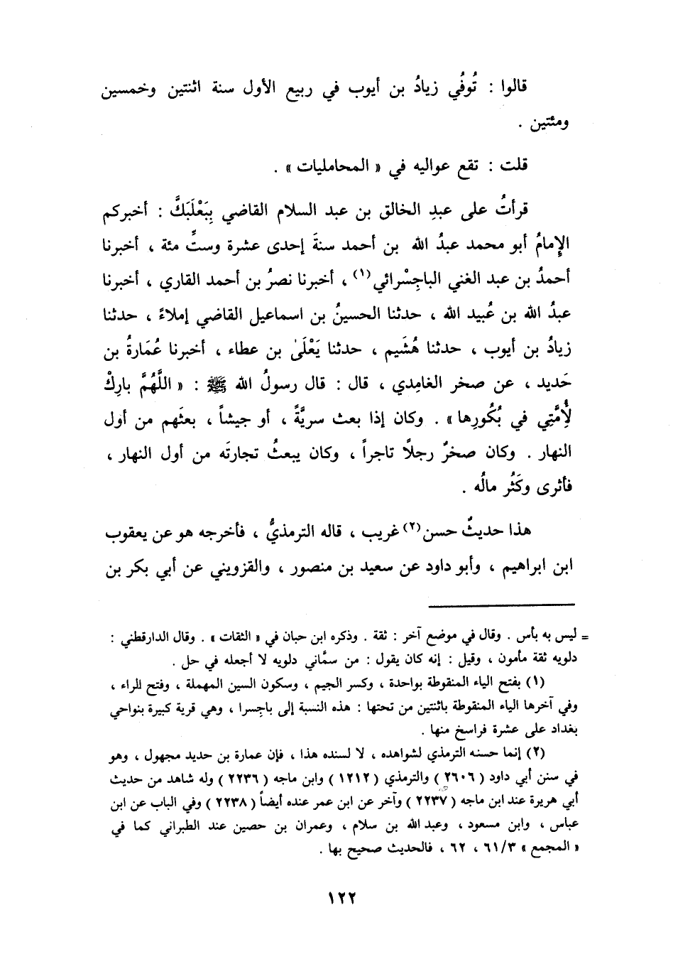 قَرَأْتُ عَلَى عَبْدِ الخَالِقِ بنِ عَبْدِ السَّلاَمِ القَاضِي ببَعْلَبَكَّ: أَخْبَرَكُمُ الإِمَامُ أَبُو مُحَمَّدٍ عَبْدُ اللهِ بنُ أَحْمَدَ سنَةَ إِحْدَى عَشْرَةَ وَسِتِّ مائَةٍ، أَخْبَرَنَا أَحْمَدُ بنُ عَبْدِ الغَنِيِّ البَاجِسْرَائِيُّ (1) ، أَخْبَرَنَا نَصْرُ بنُ أَحْمَدَ القَارِيُّ، أَخْبَرَنَا عَبْدُ اللهِ بنُ عُبَيْدِ اللهِ، حَدَّثَنَا الحُسَيْنُ بنُ اِسْمَاعِيْلَ القَاضِي إِمْلاَءً، حَدَّثَنَا زِيَادُ بنُ أَيُّوْبَ، حَدَّثَنَا هُشَيْمٌ، حَدَّثَنَا يَعْلَى بنُ عَطَاءٍ، أَخْبَرَنَا عُمَارَةُ بنُ حَدِيْدٍ، عَنْ صَخْرٍ الغَامِدِيِّ، قَالَ: