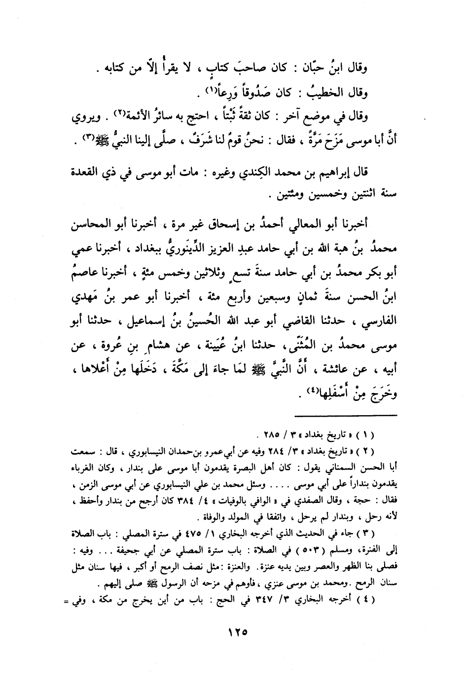 (2) " تاريخ بغداد " 3 / 284 وفيه عن أبي عمرو بن حمدان النيسابوري، قال: سمعت أبا الحسن السمناني يقول: كان أهل البصرة يقدمون أبا موسى على بندار، وكان الغرباء يقدمون بندارا على أبي موسى ... وسئل محمد بن علي النيسابوري عن أبي موسى الزمن،