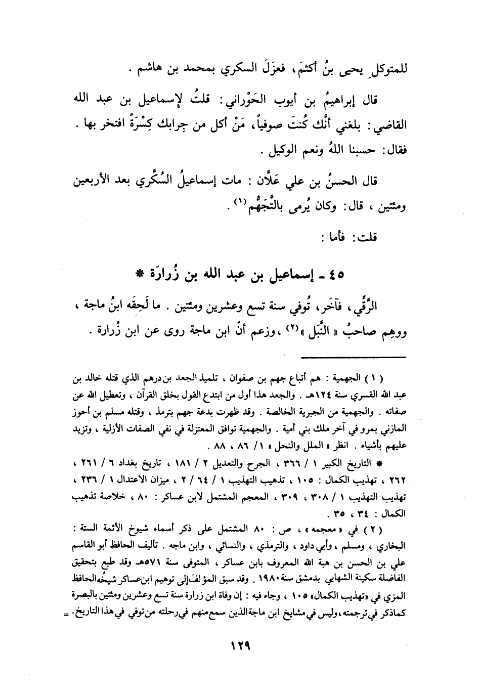 تأليف الحافظ أبو القاسم علي بن الحسن بن هبة الله المعروف بابن عساكر، المتوفى سنة 571 هـ وقد طبع بتحقيق الفاضلة سكينة الشهابي بدمشق سنة 1980. وقد سبق المؤلف إلى توهيم ابن عساكر شيخه الحافظ المزي في " تهذيب الكمال " 105، وجاء فيه: إن وفاة ابن زرارة سنة تسع وعشرين ومئتين بالبصرة كما ذكر في ترجمته، وليس في مشايخ ابن ماجة الذين سمع منهم في رحلته من توفي في هذا التاريخ. =