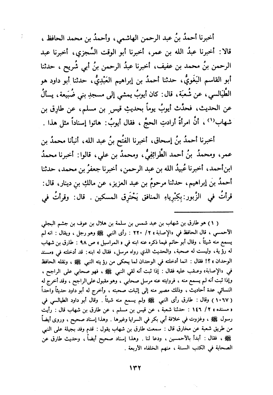 وهذا إسناد صحيح أيضا، وحديث طارق عن الصحابة في الكتب الستة، منهم الخلفاء الأربعة.