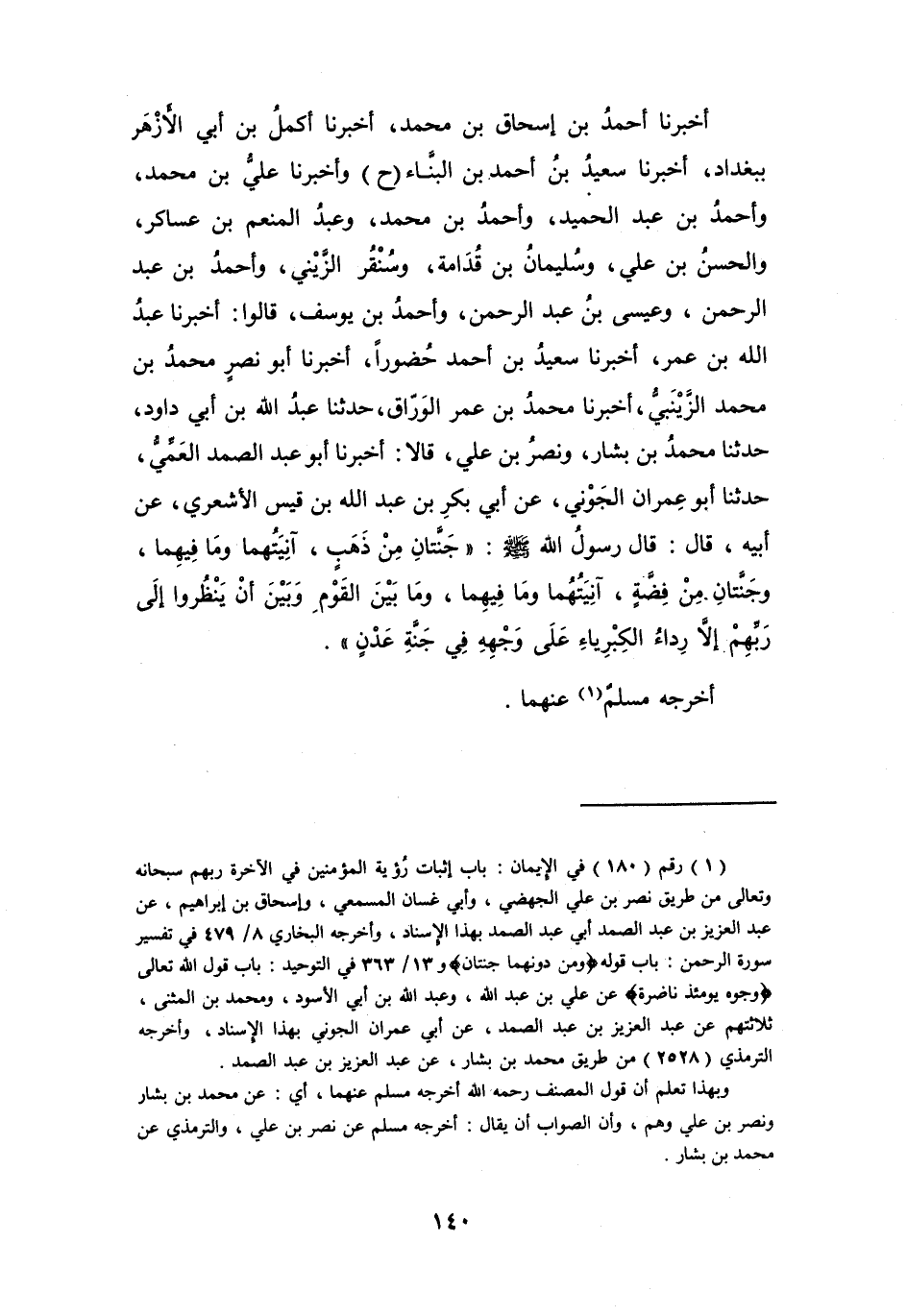 (1) رقم (180) في الايمان: باب إثبات رؤية المؤمنين في الآخرة ربهم سبحانه وتعالى من طريق نصر بن علي الجهضي، وأبي غسان المسمعي، وإسحاق بن إبراهيم، عن عبد العزيز بن عبد الصمد أبي عبد الصمد بهذا الإسناد، وأخرجه البخاري 8 / 479 في تفسير سورة الرحمن: باب قوله (ومن دونهما جنتان) و13 / 363 في التوحيد: باب قول الله تعالى (وجوه يومئذ ناضرة) عن علي بن عبد الله، وعبد الله بن أبي الأسود، ومحمد بن المثنى، ثلاثتهم عن عبد العزيز بن عبد الصمد، عن أبي عمران الجوني بهذا الإسناد، وأخرجه الترمذي (2528) من طريق محمد بن بشار، عن عبد العزيز بن عبد الصمد.
