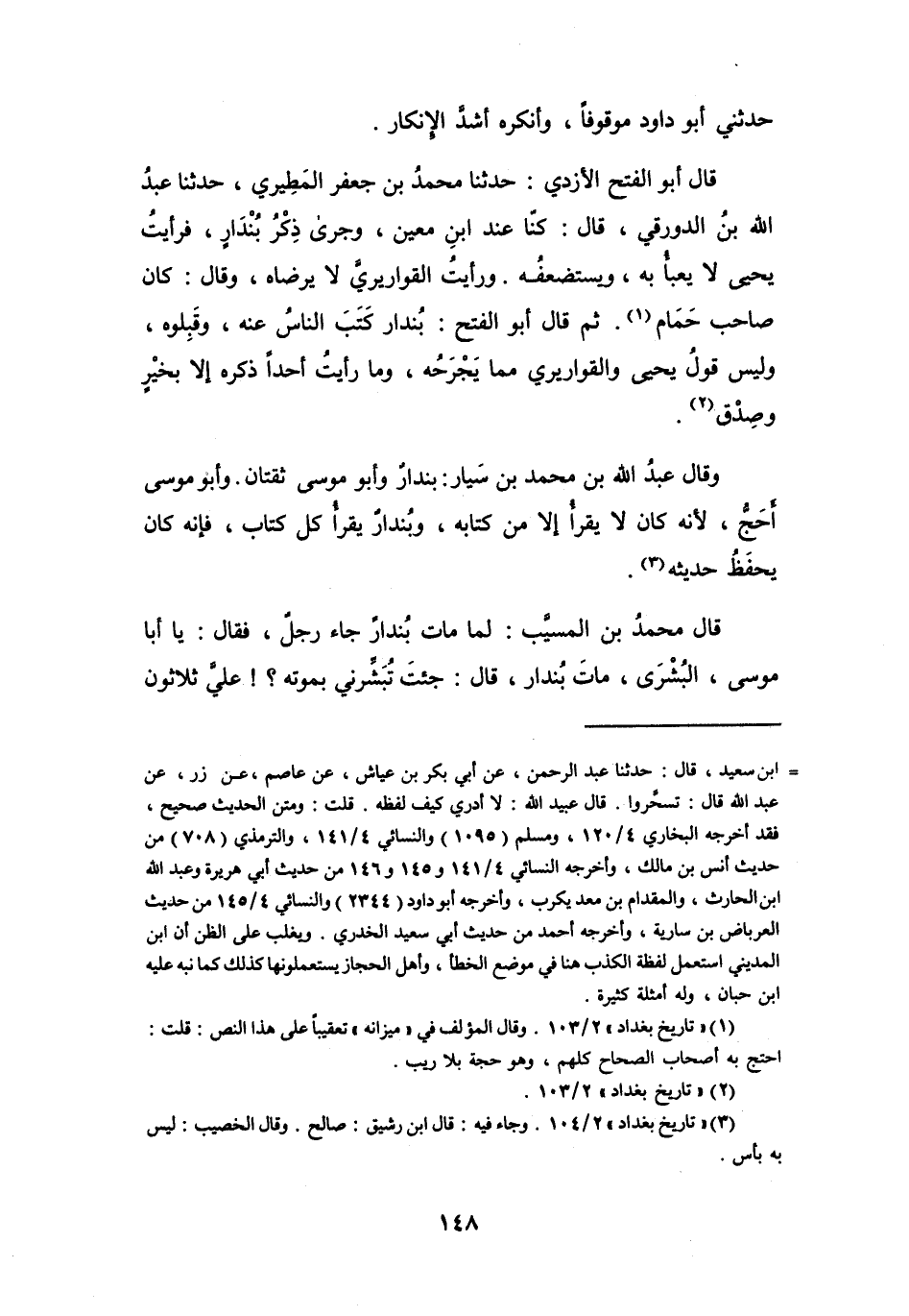 كُنَّا عِنْدَ ابْنِ مَعِيْنٍ، وَجرَى ذِكْرُ بُنْدَارٍ، فَرَأَيْتُ يَحْيَى لاَ يَعْبَأُ بهِ، وَيَسْتَضْعِفُهُ، وَرَأَيْتُ القَوَارِيْرِيَّ لاَ يَرْضَاهُ، وَقَالَ: كَانَ صَاحِبَ حَمَامٍ (1) .