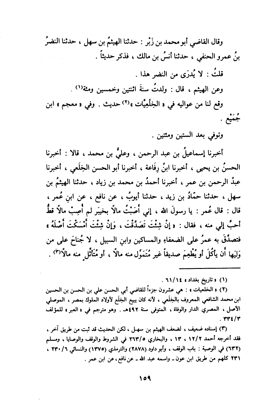 فَتَصَدَّقَ بِهِ عُمَرُ عَلَى الضُّعَفَاءِ وَالمَسَاكِيْنِ وَابْنِ السَّبِيْلِ، لاَ جُنَاحَ عَلَى مَنْ وَلِيَهَا أَنْ يَأْكُلَ أَوْ يُطْعِمَ صَدِيْقاً غَيْرَ مُتَمَوِّلٍ مِنْهُ مَالاً، أَوْ مُتَأَثِّلٍ مِنْهُ مَالاً (3) .
