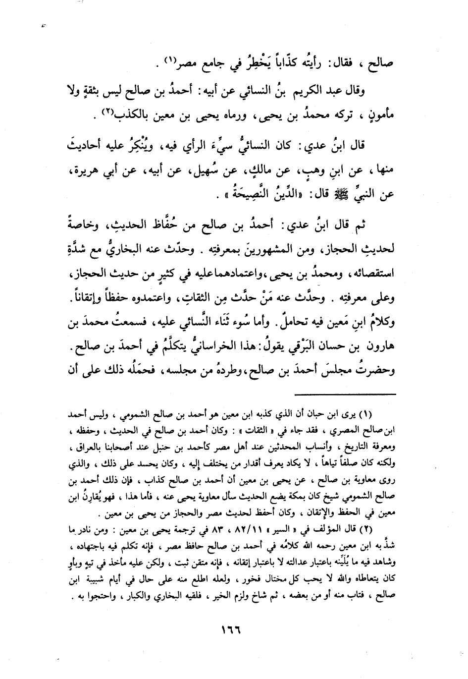 (2) قال المؤلف في " السير " 11 / 82، 83 في ترجمة يحيى بن معين: ومن نادر ما شذ به ابن معين رحمه الله كلامه في أحمد بن صالح حافظ مصر، فإنه تكلم فيه باجتهاده، وشاهد فيه ما يلينه باعتبار عدالته لا باعتبار إتقانه، فإنه متقن ثبت، ولكن عليه مأخذ في تيه وبأو كان يتعاطاه والله لا يحب كل مختال فخور، ولعله اطلع منه على حال في أيام شبيبة ابن صالح، فتاب منه أو من بعضه، ثم شاخ ولزم الخير، فلقيه البخاري والكبار، واحتجوا به.