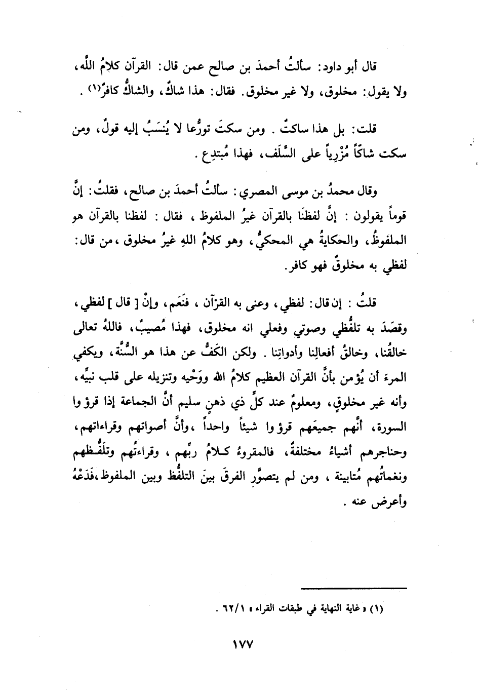 قَالَ أَبُو دَاوُدَ: سَأَلْتُ أَحْمَدَ بنَ صَالِحٍ عَمَّنْ قَالَ: القُرْآنُ كَلاَمُ اللهِ، وَلاَ يَقُوْلُ: مَخْلُوْقٌ، وَلاَ غَيْرُ مَخْلُوْقٍ، فَقَالَ:
