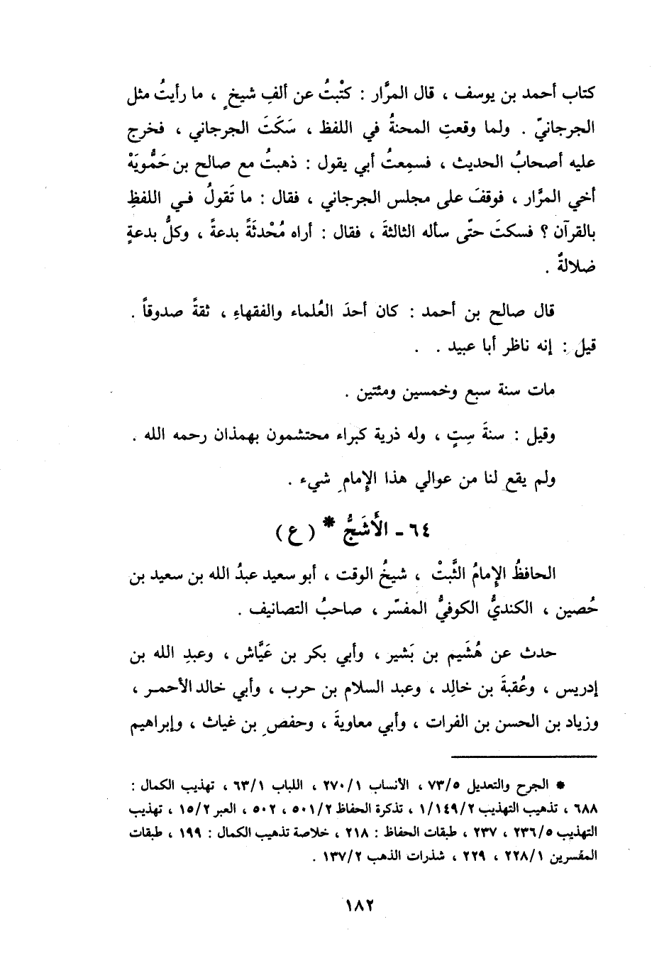(*) الجرح والتعديل 5 / 73، الأنساب 1 / 270، اللباب 1 / 63، تهذيب الكمال: 688، تذهيب التهذيب 2 / 149 / 1، تذكرة الحفاظ 2 / 501، 502، العبر 2 / 15، تهذيب التهذيب 5 / 236، 237، طبقات الحفاظ: 218، خلاصة تذهيب الكمال: 199، طبقات المفسرين 1 / 228، 229، شذرات الذهب 2 / 137.