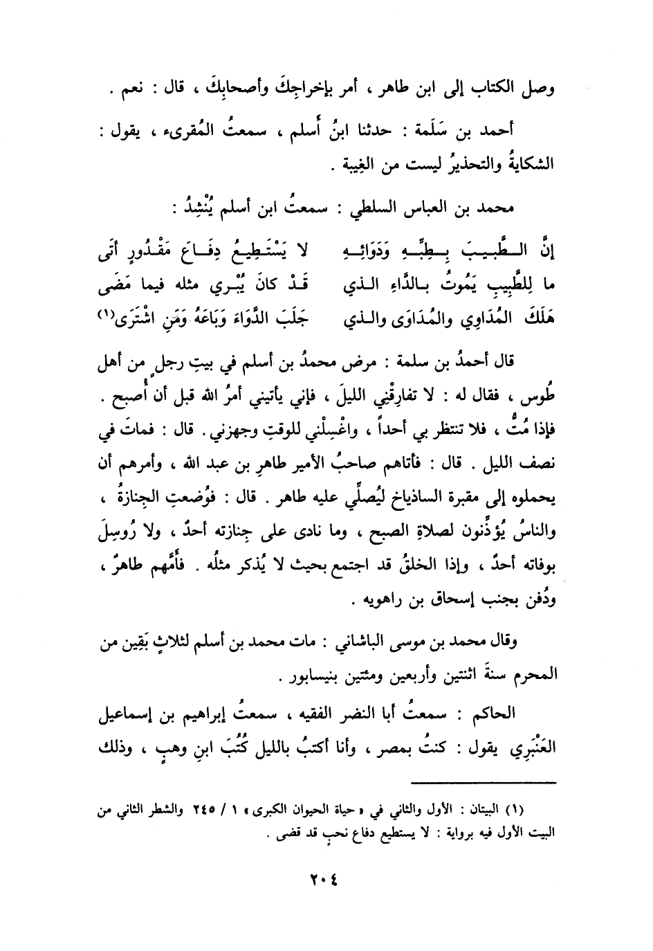 قَالَ: فَأَتَاهُمْ صَاحِبُ الأَمِيْرِ طَاهِرِ بنِ عَبْدِ اللهِ، وَأَمَرَهُمْ أَنْ يَحْمِلُوهُ إِلَى مَقْبَرَةِ السَّاذياخِ؛ لِيُصَلِّيَ عَلَيْهِ طَاهِرٌ.