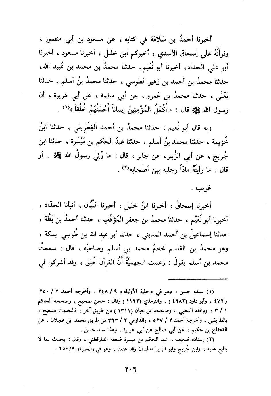 (1) سنده حسن، وهو في " حلية الأولياء " 9 / 248، وأخرجه أحمد 2 / 250 و472، وأبو داود (4682) ، والترمذي (1162) وقال: حسن صحيح، وصححه الحاكم 1 / 3، ووافقه الذهبي، وصححه ابن حبان (1311) من طريق آخر، فالحديث صحيح، بالطريقين، وأخرجه أحمد 2 / 527، والدارمي 2 / 323 من طريق محمد بن عجلان، عن القعقاع بن حكيم، عن أبي صالح عن أبي هريرة. وهذا سند حسن.
