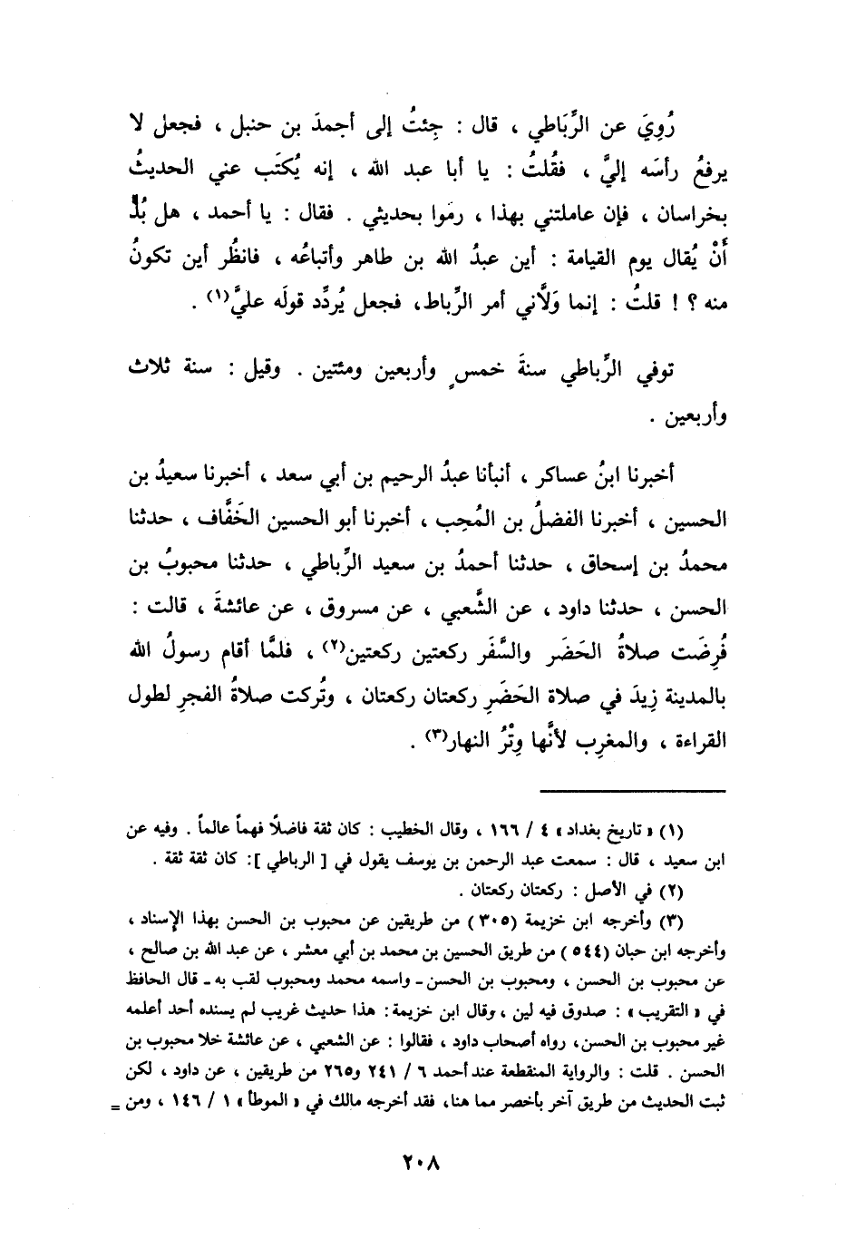 رُوِيَ عَنِ الرِّبَاطِيِّ، قَالَ: جِئْتُ إِلَى أَحْمَدَ بنِ حَنْبَلٍ، فَجَعَلَ لاَ يَرْفَعُ رَأْسَهُ إِلَيَّ، فقُلْتُ: يَا أَبَا عَبْدِ اللهِ، إِنَّهُ يُكْتَبُ عَنِّيَ الحَدِيْثُ بِخُرَاسَانَ، فَإِنْ عَامَلْتَنِي بِهَذَا، رَمَوا بِحَدِيْثِي.