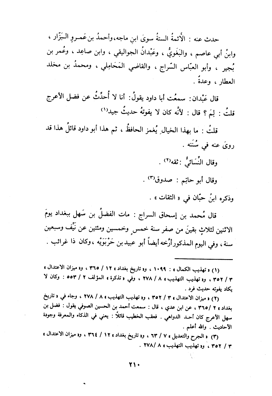 (2) " ميزان الاعتدال " 3 / 352، و" تهذيب التهذيب " 8 / 278، وجاء في " تاريخ بغداد " 2 / 365، عن ابن عدي، قال: سمعت أحمد بن الحسين الصوفي يقول: فضل بن سهل الاعرج كان أحد الدواهي. فعقب الخطيب قائلا: يعني في الذكاء والمعرفة وجودة الأحاديث. والله أعلم.
