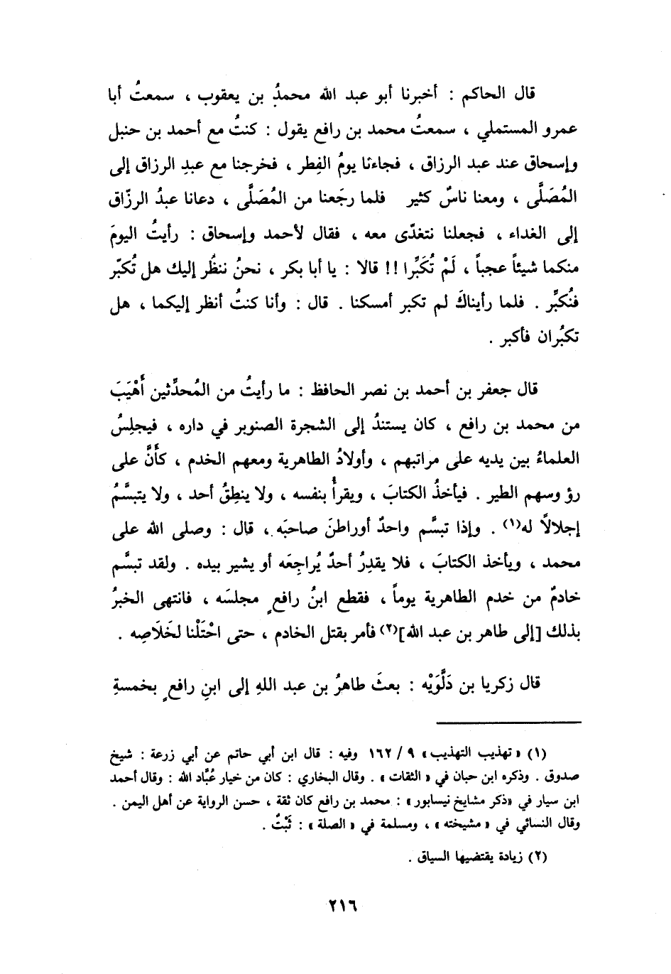 كُنْتُ مَعَ أَحْمَدَ بنِ حَنْبَلٍ وَإِسْحَاقَ عِنْدَ عَبْدِ الرَّزَّاقِ، فَجَاءنَا يَوْمُ الفِطرِ، فَخَرَجْنَا مَعَ عَبْدِ الرَّزَّاقِ إِلَى المُصَلَّى، وَمَعَنَا نَاسٌ كَثِيْرٌ، فَلَمَّا رَجَعنَا مِنَ المُصَلَّى، دَعَانَا عَبْدُ الرَّزَّاقِ إِلَى الغَدَاءِ، فَجَعَلَنَا نَتَغَدَّى مَعَهُ، فَقَالَ لأَحْمَدَ وَإِسْحَاقَ: رَأَيْتُ اليَوْمَ مِنْكُمَا شَيْئاً عَجَباً، لَمْ تُكَبِّرَا!!