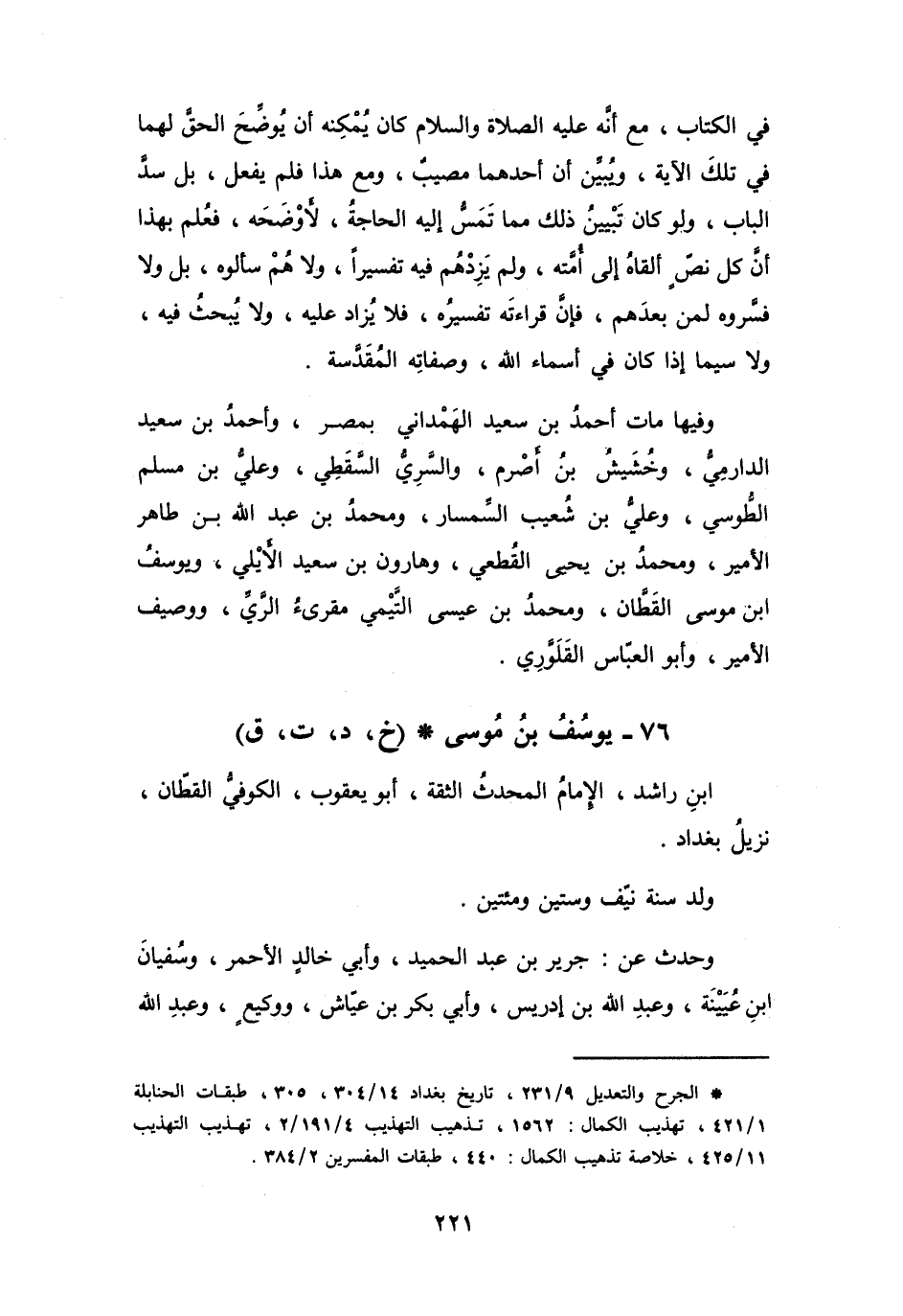 (*) الجرح والتعديل 9 / 231، تاريخ بغداد 14 / 304، 305، طبقات الحنابلة 1 / 421، تهذيب الكمال: 1562، تذهيب التهذيب 4 / 191 / 2، تهذيب التهذيب 11 / 425، خلاصة تذهيب الكمال: 440، طبقات المفسرين 2 / 384.