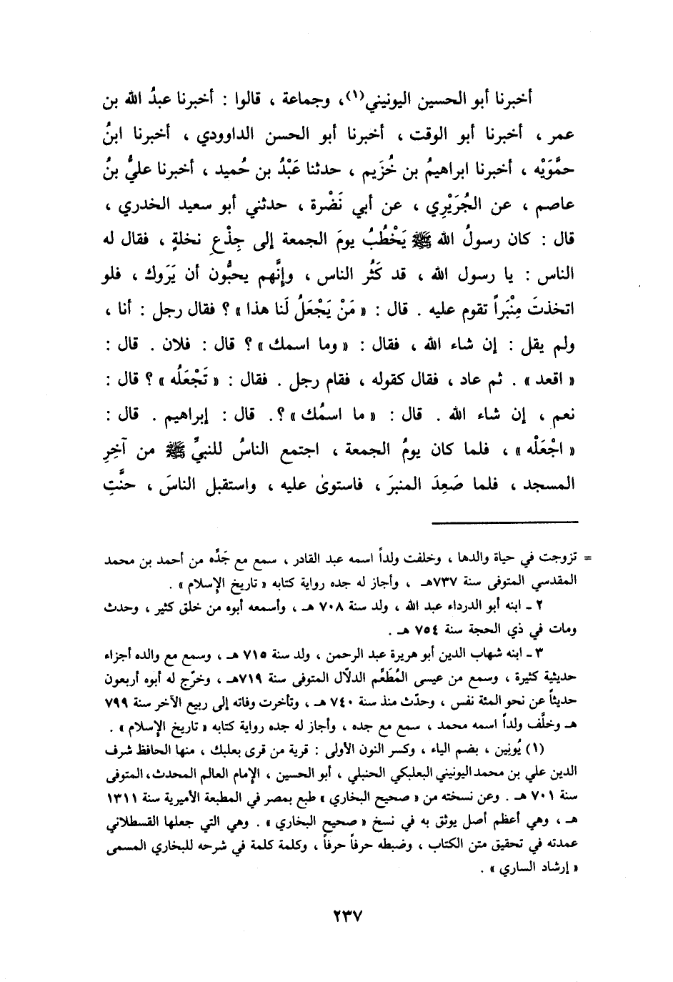 كَانَ رَسُوْلُ اللهِ -صَلَّى اللَّهُ عَلَيْهِ وَسَلَّمَ- يَخْطُبُ يَوْمَ الجُمُعَةِ إِلَى جِذْعِ نَخْلَةٍ، فَقَالَ لَهُ النَّاسُ: يَا رَسُوْلَ اللهِ، قَدْ كَثُرَ النَّاسُ، وَإِنَّهُم يُحِبُّونَ أَنْ يَرَوكَ، فَلَوِ اتَّخَذْتَ مِنْبَراً تَقُوْمُ عَلَيْهِ.