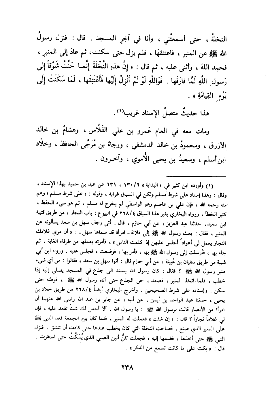 وأخرج البخاري أيضا 4 / 268 من طريق خلاد بن يحيى، حدثنا عبد الواحد بن أيمن، عن أبيه، عن جابر بن عبد الله رضي الله عنهما أن امرأة من الانصار قالت لرسول الله صلى الله عليه وسلم: يا رسول الله، ألا أجعل لك شيئا تقعد عليه، فإن لي غلاما نجارا؟ قال: " إن شئت " فعملت له المنبر، فلما كان يو الجمعة قعد النبي صلى الله عليه وسلم على المنبر الذي صنع، فصاحت النخلة التي كان يخطب عندها حتى كادت أن تنشق، فنزل النبي صلى الله عليه وسلم حتى أخذها، فضمها إليه، فجعلت تئن أنين الصبي الذي يسكت حتى استقرت. قال: " بكت على ما كانت تسمع من الذكر ".