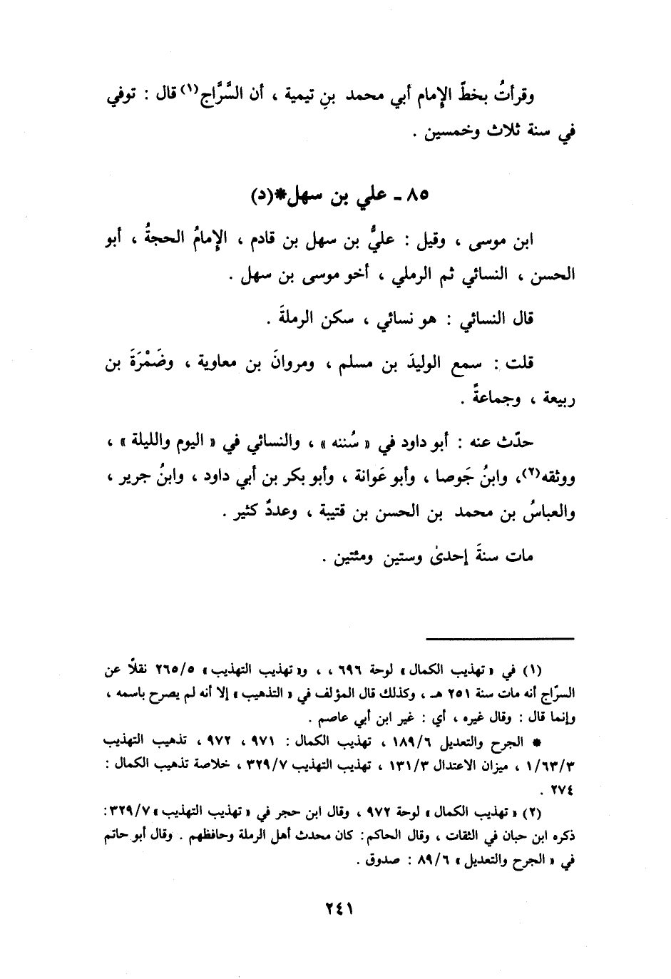 (1) في " تهذيب الكمال " لوحة 696،، و" تهذيب التهذيب " 5 / 265 نقلا عن السراج أنه مات سنة 251 هـ، وكذلك قال المؤلف في " التذهيب " إلا أنه لم يصرح باسمه، وإنما قال: وقال غيره، أي: غير ابن أبي عاصم.