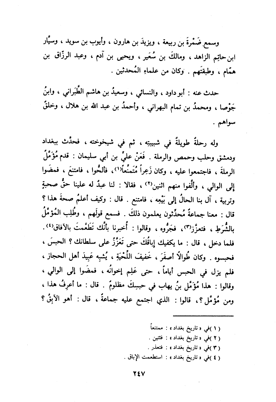 فَعَنْ عَلِيِّ بنِ أَبِي سُلَيْمَانَ: قَدِمَ مُؤَمَّلٌ الرَّمْلَةَ، فَاجْتَمَعُوا عَلَيْهِ، وَكَانَ زَعِراً مُتَمَنِّعاً (1) ، فَأَلَحُّوا، فَامْتَنَعَ، فَمَضَوْا إِلَى الوَالِي، وَأَلَّفُوا مِنْهُمُ اثْنَيْنِ (2) ، فَقَالا: لَنَا عَبْدٌ لَهُ عَلَيْنَا حَقُّ صُحْبَةٍ وَتَرْبِيَةٍ، آلَ بِنَا الحَالُ إِلَى بَيْعِهِ، فَامْتَنَعَ.