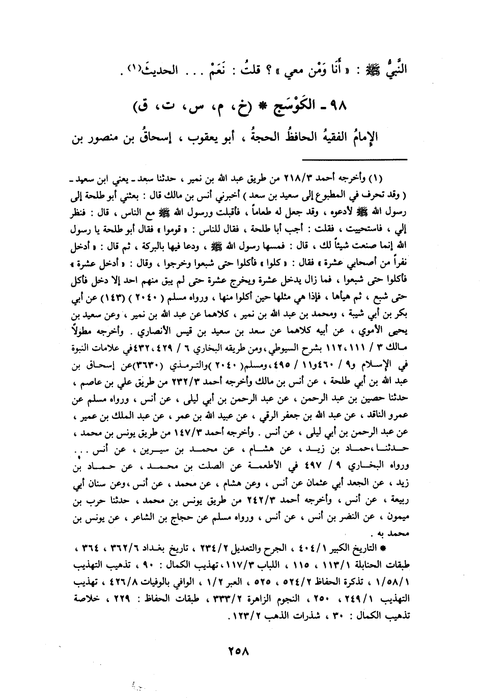 98 - الكَوْسَجُ أَبُو يَعْقُوْبَ إِسْحَاقُ بنُ مَنْصُوْرٍ * (خَ، م، س، ت، ق)