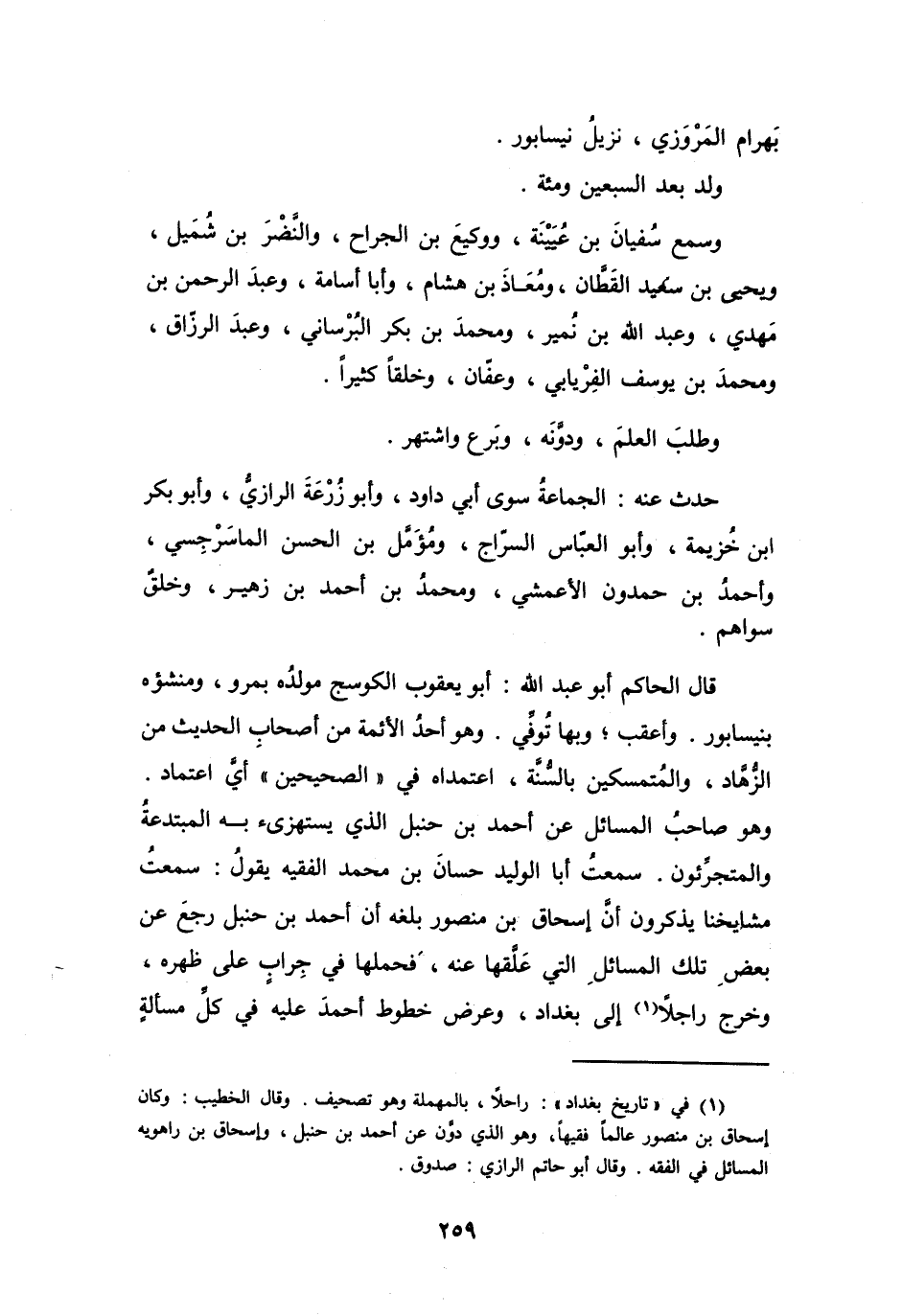 قَالَ الحَاكِمُ أَبُو عَبْدِ اللهِ: أَبُو يَعْقُوْبَ الكَوْسَجُ مَوْلِدُهُ بِمَرْوَ، وَمَنشَؤُه بِنَيْسَابُوْرَ، وَأَعقَبَ؛ وَبِهَا تُوُفِّيَ، وَهُوَ أَحَدُ الأَئِمَّةِ، مِنْ أَصْحَابِ الحَدِيْثِ، مِنَ الزُّهَّادِ وَالمُتَمَسِّكِيْنَ بِالسُّنَّةِ، اعتَمَدَاهُ فِي (الصَّحِيْحَيْنِ) أَيَّ اعتِمَادٍ، وَهُوَ صَاحِبُ المَسَائِلِ عَنْ أَحْمَدَ بنِ حَنْبَلٍ الَّذِي يَسْتَهزِئُ بِهِ المُبتَدِعَةُ وَالمُتَجِرِّئُونَ، سَمِعْتُ أَبَا الوَلِيْدِ حَسَّانَ بنَ مُحَمَّدٍ الفَقِيْهَ يَقُوْلُ: