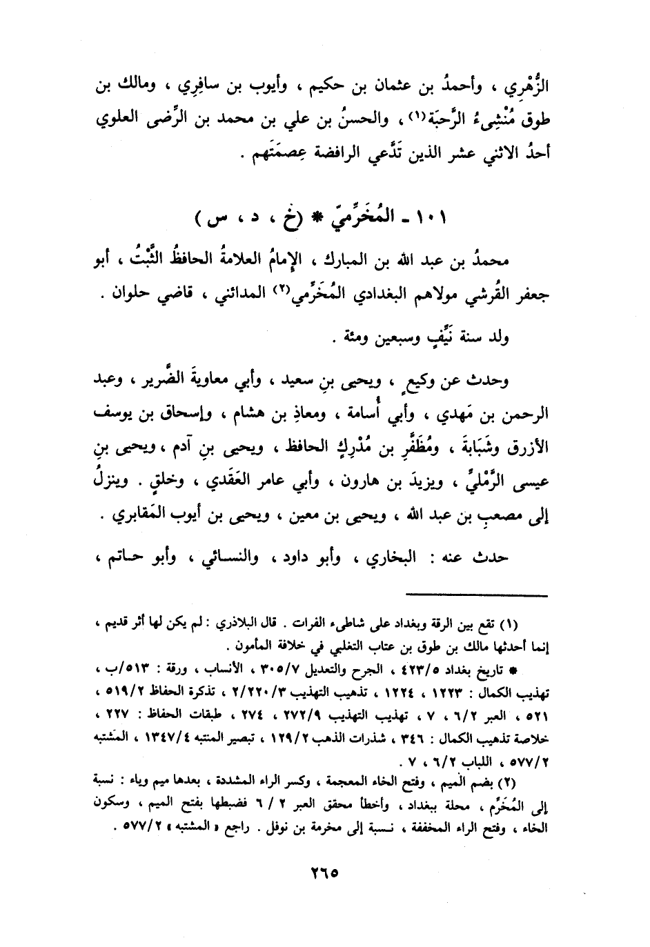 (2) بضم الميم، وفتح الخاء المعجمة، وكسر الراء المشددة، بعدها ميم وياء: نسبة إلى المخرم، محلة ببغداد، وأخطأ محقق العبر 2 / 6 فضبطها بفتح الميم، وسكون الخاء، وفتح الراء المخففة، نسبة إلى مخرمة بن نوفل. راجع " المشتبه " 2 / 577.