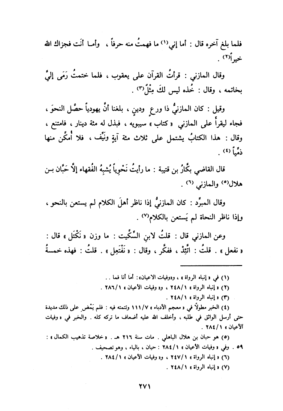 قَالَ القَاضِي بَكَّارُ بنُ قُتَيْبَةَ: مَا رَأَيْتُ نَحْوِيّاً يُشْبِهُ الفُقَهَاءَ إِلاَّ حَبَّانَ بنَ هِلاَلٍ (5) وَالمَازِنِيَّ (6) .