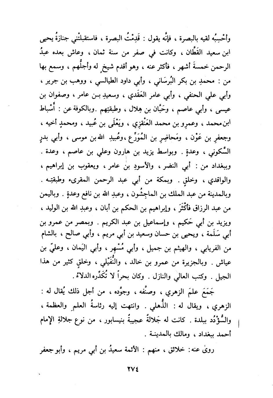 وَأَحْسِبُهُ لَقِيَهُ بِالبَصْرَةِ، فَإِنَّهُ يَقُوْلُ: قَدِمْتُ البَصْرَةَ، فَاسْتَقْبَلَتْنِي جَنَازَةُ يَحْيَى بنِ سَعِيْدٍ القَطَّانِ، وَكَانَتْ فِي صَفَرٍ، مِنْ سَنَةِ ثَمَانٍ، وَعَاشَ بَعْدَهُ عَبْدُ الرَّحْمَنِ خَمْسَةَ أَشْهُرٍ، فَأَكْثَرَ عنْهُ، وَهُوَ أَقدَمُ شَيْخٍ لَهُ وَأَجَلُّهُم.