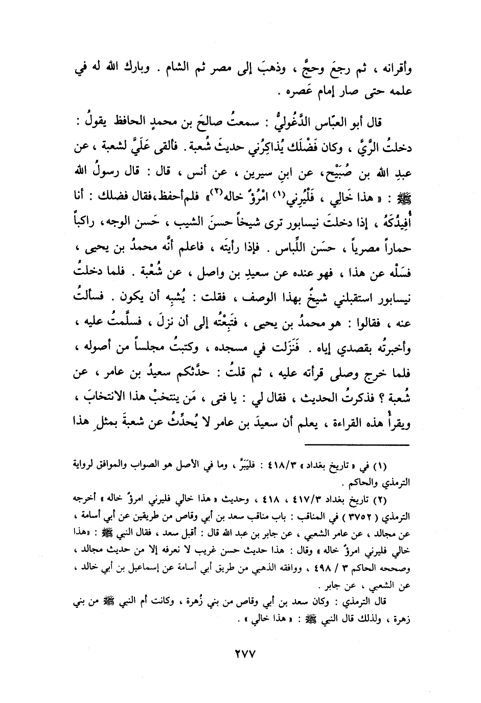 (2) تاريخ بغداد 3 / 417، 418، وحديث " هذا خالي فليرني امرؤ خاله " أخرجه الترمذي (3752) في المناقب: باب مناقب سعد بن أبي وقاص من طريقين عن أبي أسامة، عن مجالد، عن عامر الشعبي، عن جابر بن عبد الله قال: أقبل سعد، فقال النبي صلى الله عليه وسلم: " هذا خالي فليرني امرؤ خاله " وقال: هذا حديث حسن غريب لا نعرفه إلا من حديث مجالد، وصححه الحاكم 3 / 498، ووافقه الذهبي من طريق أبي أسامة عن إسماعيل بن أبي خالد، عن الشعبي، عن جابر.