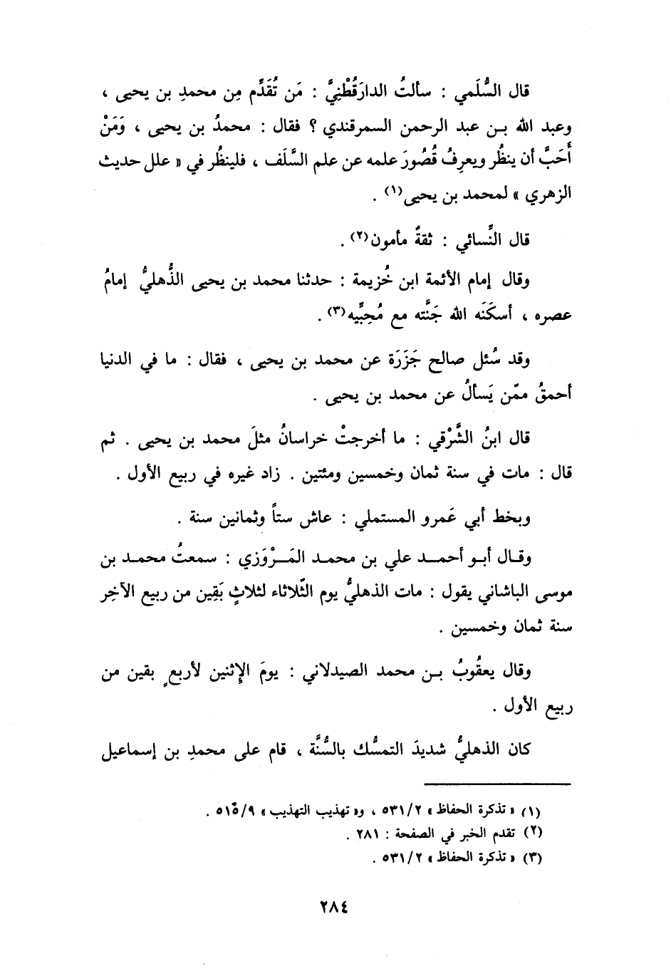 فَقَالَ: مُحَمَّدُ بنُ يَحْيَى، وَمَنْ أَحَبَّ أَنْ يَنْظُرَ وَيعرِفَ قُصُورَ علمِهِ عَنْ عِلْمِ السَّلَفِ، فلينظُرْ فِي (عِلَلِ حَدِيْثِ الزُّهْرِيِّ) لِمُحَمَّدِ بنِ يَحْيَى (1) .