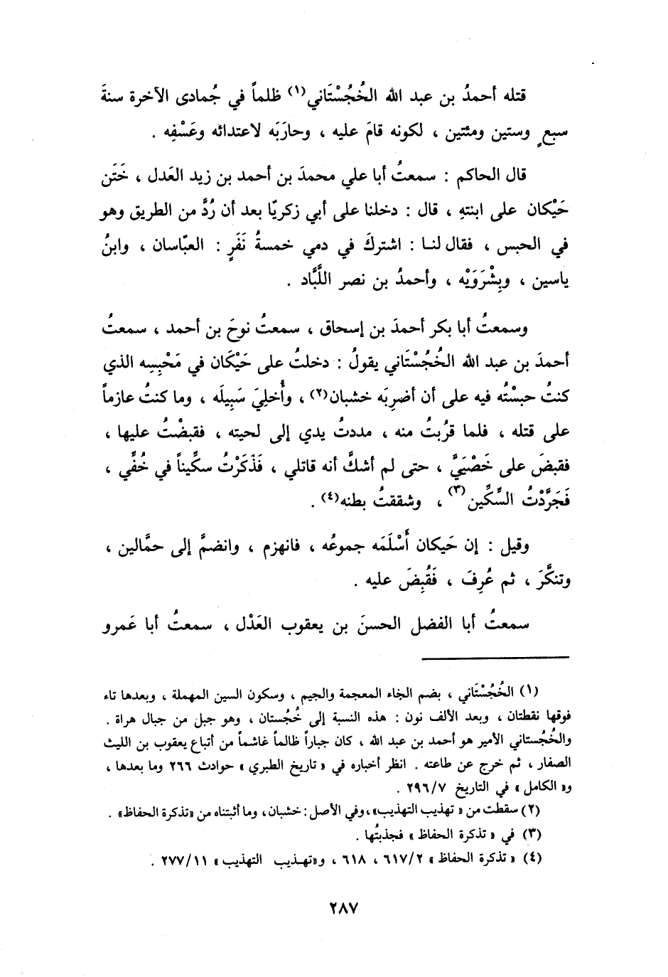 وَسَمِعْتُ أَبَا بَكْرٍ أَحْمَدَ بنَ إِسْحَاقَ، سَمِعْتُ نُوْحَ بنَ أَحْمَدَ، سَمِعْتُ أَحْمَدَ بنَ عَبْدِ اللهِ الخُجُسْتَانِيَّ يَقُوْلُ: دَخَلْتُ عَلَى حَيْكَانَ فِي مَحْبِسِهِ الَّذِي كُنْتُ حبسْتُهُ فِيْهِ عَلَى أَنْ أَضْرِبَهُ خشبان (2) ، وَأُخَلِيَ سَبِيلَهُ، وَمَا كُنْتُ عَازِماً عَلَى قَتْلِهِ، فَلَمَّا قَرُبْتُ مِنْهُ، مَدَدْتُ يَديَّ إِلَى لِحْيَتِهِ، فَقَبَضْتُ عَلَيْهَا، فَقَبَضَ عَلَى خَصْيَيَّ، حَتَّى لَمْ أَشُكَّ أَنَّهُ قَاتلِي، فَذَكَرْتُ سِكِّيناً فِي خُفِّي، فَجَرَّدْتُ السِّكِّينَ (3) ، وَشَقَقْتُ بَطْنَهُ (4) .