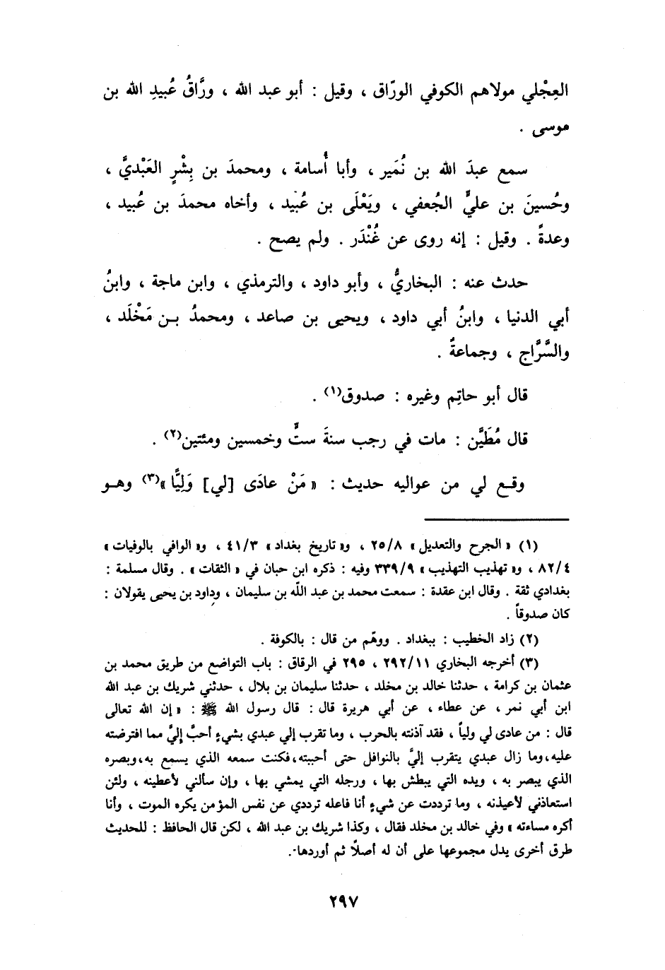 (1) " الجرح والتعديل " 8 / 25، و" تاريخ بغداد " 3 / 41، و" الوافي بالوفيات " 4 / 82، و" تهذيب التهذيب " 9 / 339 وفيه: ذكره ابن حبان في " الثقات ". وقال مسلمة: بغدادي ثقة.