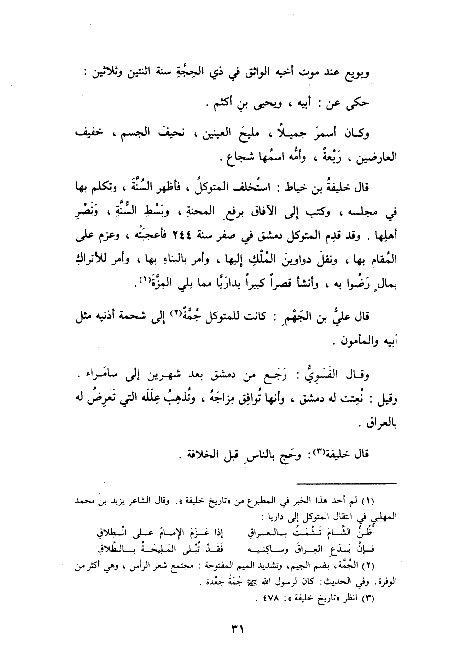 قَالَ عَلِيُّ بنُ الجَهْمِ: كَانَتْ لِلْمُتَوَكِّلِ جُمَّةٌ (2) إِلَى شَحْمَةِ أُذُنَيْهِ مِثْلَ أَبِيْهِ وَالمَأْمُوْنِ.